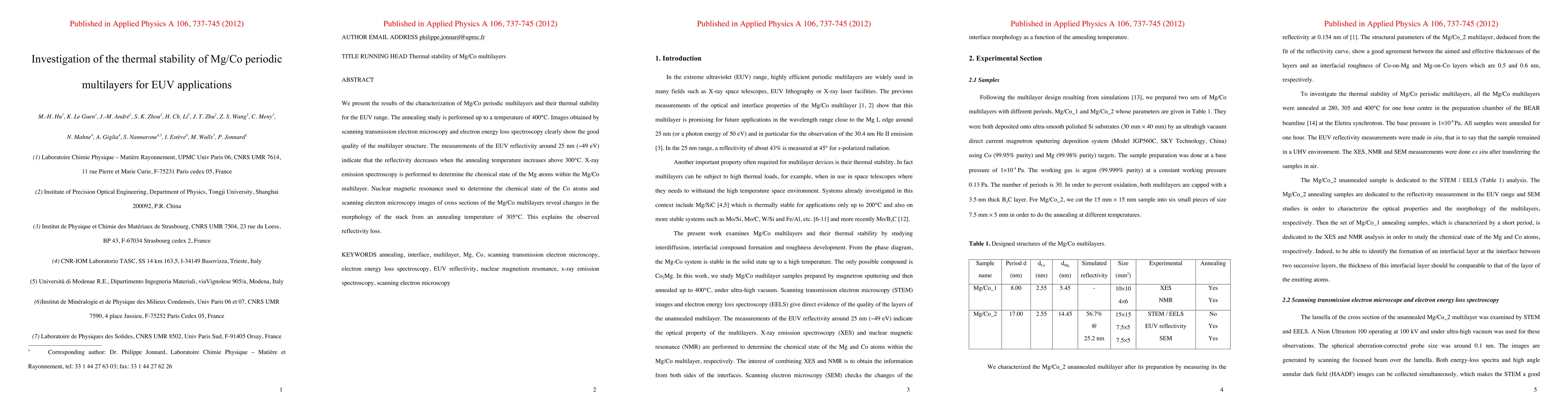This study investigates the thermal stability of Mg/Co periodic multilayers for Extreme Ultraviolet (EUV) applications, revealing that reflectivity decreases above 300°C due to morphological changes observed via microscopy and spectroscopy techniques.