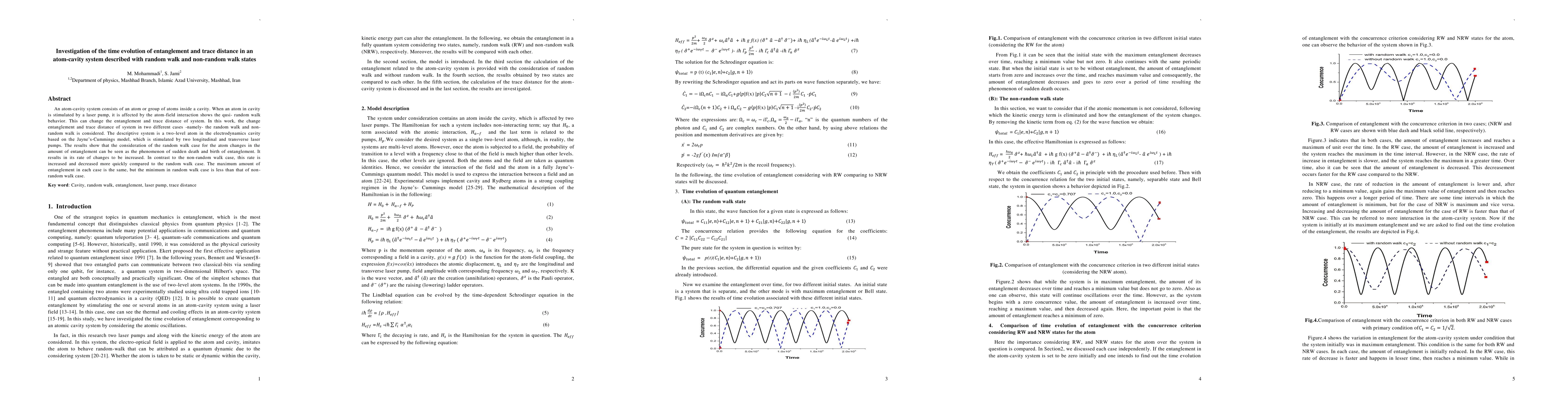 An atom-cavity system consists of an atom or group of atoms inside a cavity. When an atom in cavity is stimulated by a laser pump, it is affected by the atom-field interaction shows the quasi-random walk behavior. This can change the entanglement and trace distance of system. In this work, the change entanglement and trace distance of system in two different cases namely the random walk and non-random walk is considered. The descriptive system is a two-level atom in the electrodynamics cavity based on the Jaynes-Cummings model, which is stimulated by two longitudinal and transverse laser pumps. The results show that the consideration of the random walk case for the atom changes in the amount of entanglement can be seen as the phenomenon of sudden death and birth of entanglement. It results in its rate of changes to be increased. In contrast to the non-random walk case, this rate is increased and decreased more quickly compared to the random walk case. The maximum amount of entanglement in each case is the same, but the minimum in random walk case is less than that of non-random walk case.