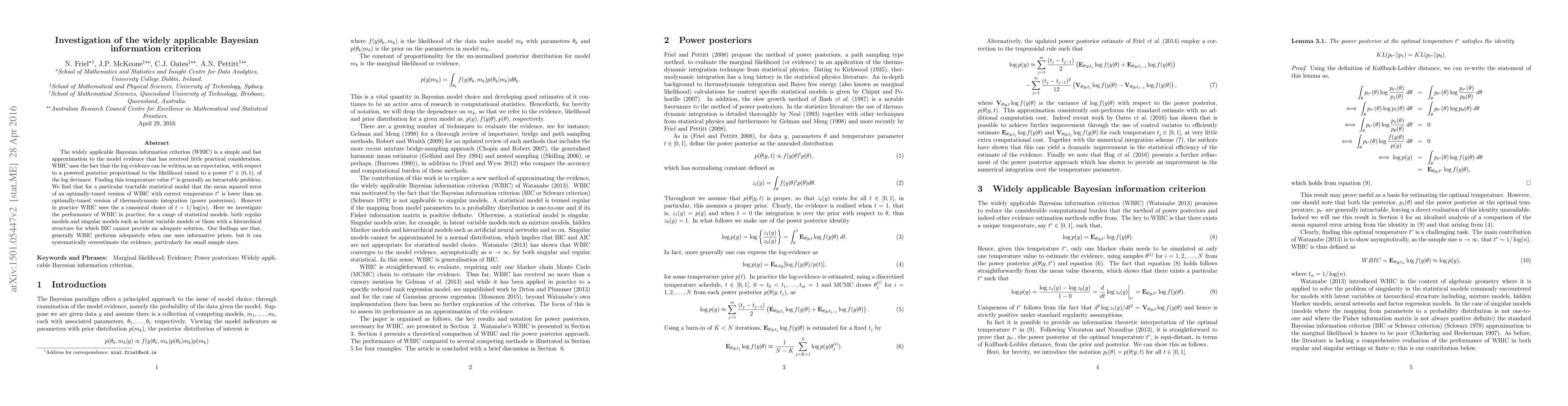 The widely applicable Bayesian information criterion (WBIC) is a simple and fast approximation to the model evidence that has received little practical consideration. WBIC uses the fact that the log evidence can be written as an expectation, with respect to a powered posterior proportional to the likelihood raised to a power $t^*\in{(0,1)}$, of the log deviance. Finding this temperature value $t^*$ is generally an intractable problem. We find that for a particular tractable statistical model that the mean squared error of an optimally-tuned version of WBIC with correct temperature $t^*$ is lower than an optimally-tuned version of thermodynamic integration (power posteriors). However in practice WBIC uses the a canonical choice of $t=1/\log(n)$. Here we investigate the performance of WBIC in practice, for a range of statistical models, both regular models and singular models such as latent variable models or those with a hierarchical structure for which BIC cannot provide an adequate solution. Our findings are that, generally WBIC performs adequately when one uses informative priors, but it can systematically overestimate the evidence, particularly for small sample sizes.