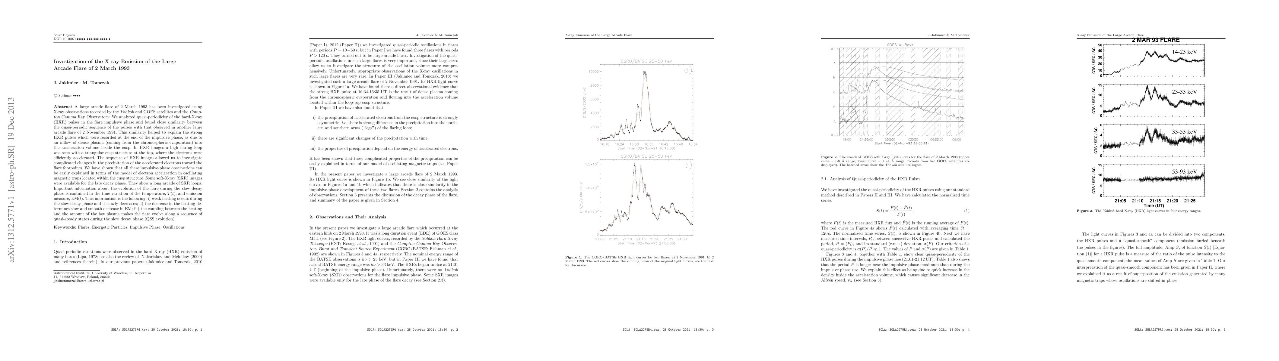 A large arcade flare of 2 March 1993 has been investigated using X-ray observations recorded by the {\sl Yohkoh} and GOES satellites and the {\sl Compton Gamma Ray Observatory}. We analyzed quasi-periodicity of the hard-X-ray (HXR) pulses in the flare impulsive phase and found close similarity between the quasi-periodic sequence of the pulses with that observed in another large arcade flare of 2 November 1991. This similarity helped to explain the strong HXR pulses which were recorded at the end of the impulsive phase, as due to an inflow of dense plasma (coming from the chromospheric evaporation) into the acceleration volume inside the cusp. In HXR images a high flaring loop was seen with a triangular cusp structure at the top, where the electrons were efficiently accelerated. The sequence of HXR images allowed us to investigate complicated changes in the precipitation of the accelerated electrons toward the flare footpoints. We have shown that all these impulsive-phase observations can be easily explained in terms of the model of electron acceleration in oscillating magnetic traps located within the cusp structure. Some soft-X-ray (SXR) images were available for the late decay phase. They show a long arcade of SXR loops. Important information about the evolution of the flare during the slow decay phase is contained in the time variation of the temperature, $T(t)$, and emission measure, EM$(t)$. This information is the following: i) weak heating occurs during the slow decay phase and it slowly decreases; ii) the decrease in the heating determines slow and smooth decrease in EM; iii) the coupling between the heating and the amount of the hot plasma makes the flare evolve along a sequence of quasi-steady states during the slow decay phase (QSS evolution).