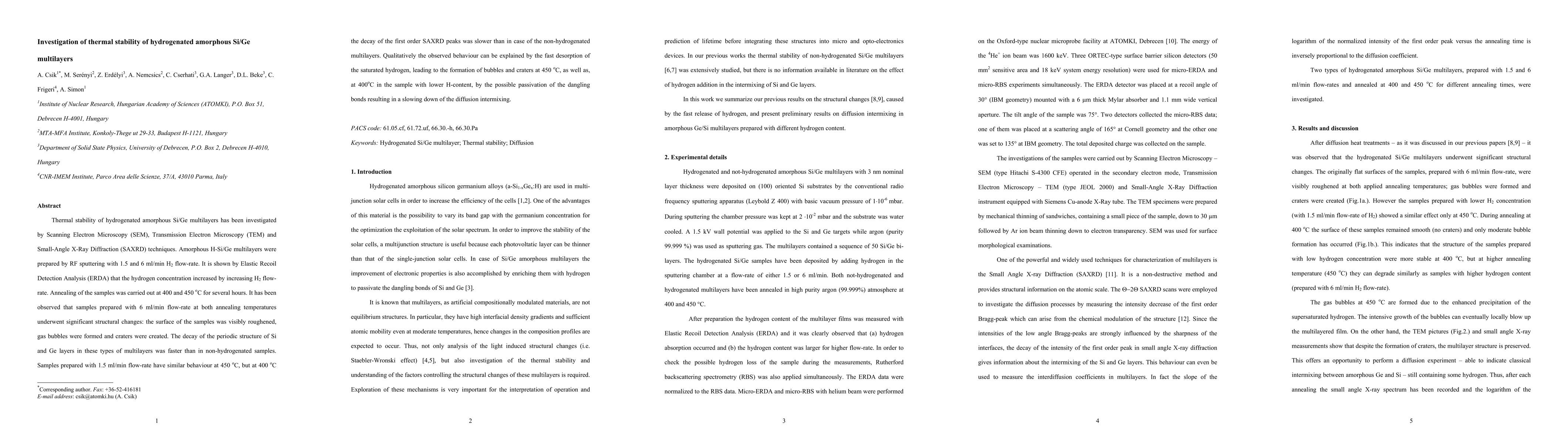 This study investigates the thermal stability of hydrogenated amorphous Si/Ge multilayers prepared by RF sputtering, revealing significant structural changes upon annealing at 400 and 450°C, particularly in samples with higher hydrogen content, due to hydrogen desorption causing bubble formation and craters. At lower hydrogen concentrations, passivation of dangling bonds slows down diffusion intermixing.