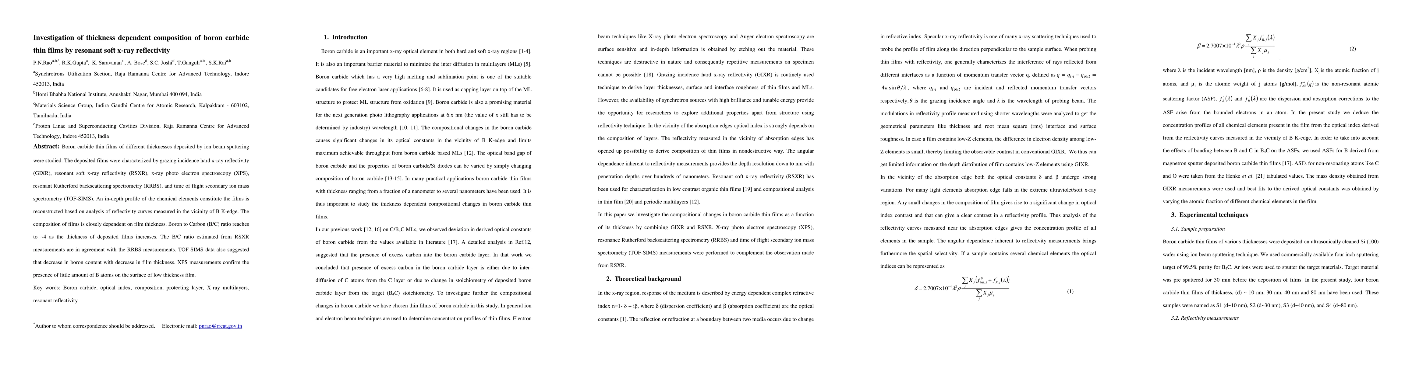 This study investigates boron carbide thin films deposited via ion beam sputtering using resonant soft x-ray reflectivity and other techniques. The composition varies with film thickness, showing a higher B/C ratio (~4) in thicker films, confirmed by resonant soft x-ray reflectivity and Rutherford backscattering spectrometry.