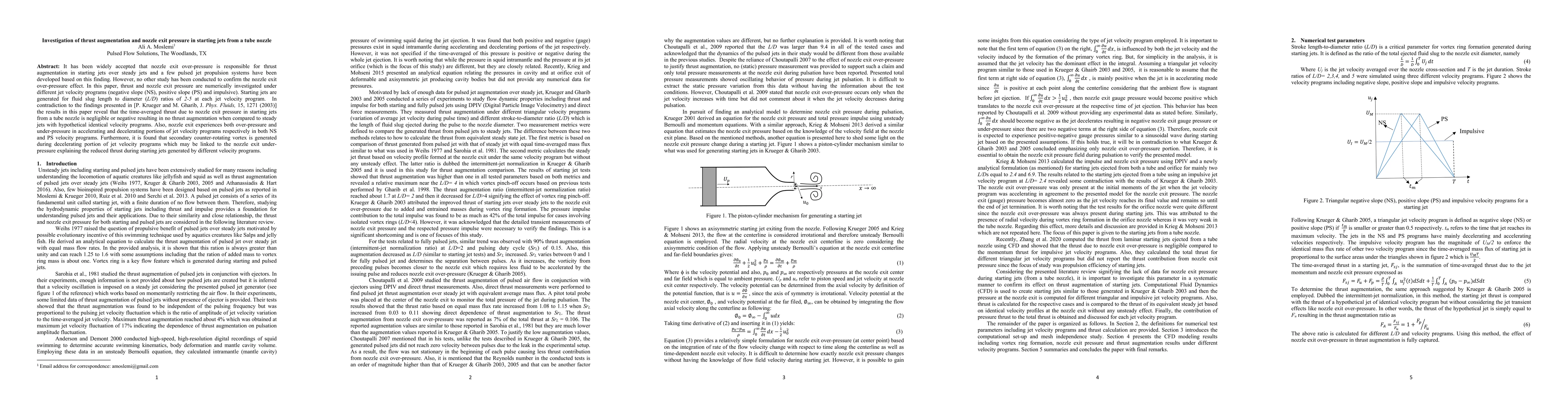 It has been widely accepted that nozzle exit over-pressure is responsible for thrust augmentation in starting jets over steady jets and a few pulsed jet propulsion systems have been developed based on this finding. However, no other study has been conducted to confirm the nozzle exit over-pressure effect. In this paper, thrust and nozzle exit pressure are numerically investigated under different jet velocity programs (negative slope (NS), positive slope (PS) and impulsive). Starting jets are generated for fluid slug length to diameter (L/D) ratios of 2-5 at each jet velocity program. In contradiction to the findings presented in [P. Krueger and M. Gharib, J. Phys. Fluids, 15, 1271 (2003)] the results in this paper reveal that the time-averaged thrust due to nozzle exit pressure in starting jets from a tube nozzle is negligible or negative resulting in no thrust augmentation when compared to steady jets with hypothetical identical velocity programs. Also, nozzle exit experiences both over-pressure and under-pressure in accelerating and decelerating portions of jet velocity programs respectively in both NS and PS velocity programs. Furthermore, it is found that secondary counter-rotating vortex is generated during decelerating portion of jet velocity programs which may be linked to the nozzle exit underpressure explaining the reduced thrust during starting jets generated by different velocity programs.