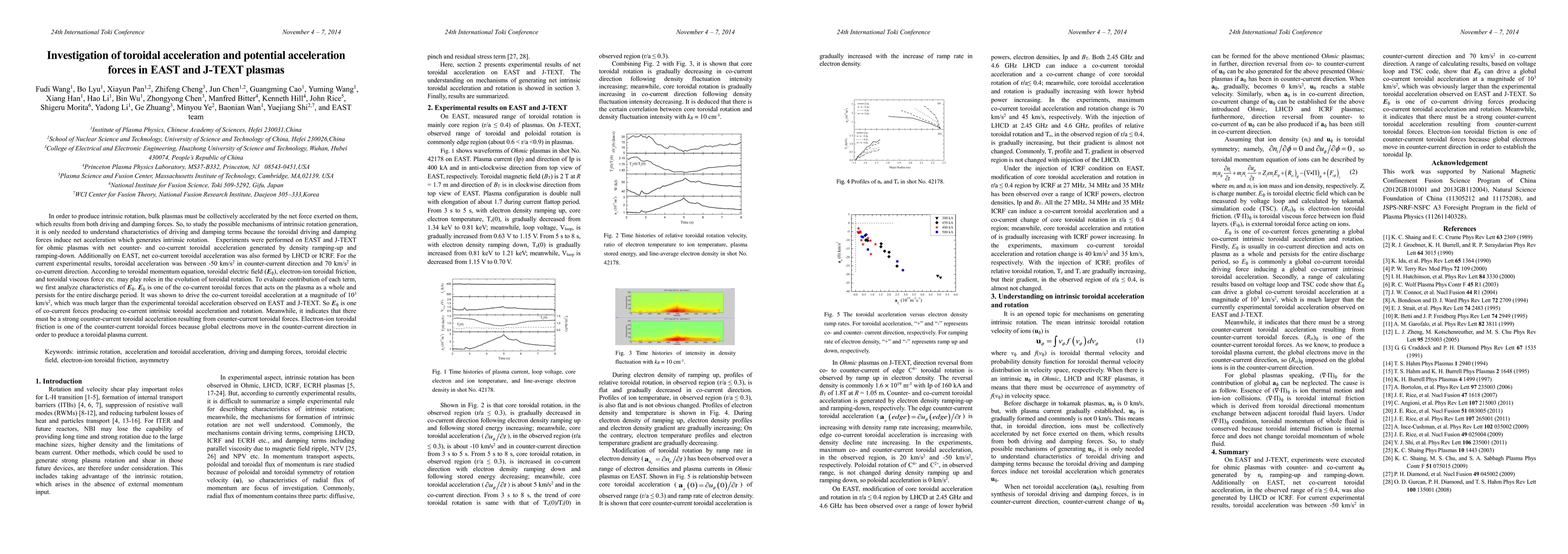 This study investigates toroidal acceleration forces in EAST and J-TEXT plasmas, revealing co-current acceleration up to 70 km/s^2 and counter-current up to -50 km/s^2. The toroidal electric field E-(g(f)) was found to significantly contribute to co-current acceleration, while counter-current forces, including electron-ion toroidal friction, also play crucial roles in generating intrinsic toroidal rotation.