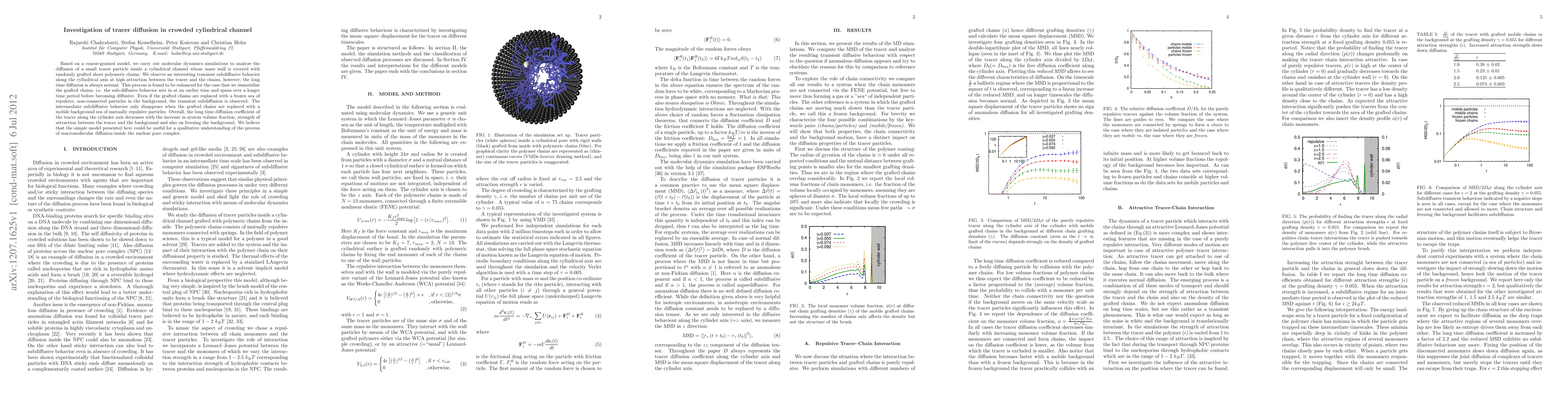 Based on a coarse-grained model, we carry out molecular dynamics simulations to analyze the diffusion of a small tracer particle inside a cylindrical channel whose inner wall is covered with randomly grafted short polymeric chains. We observe an interesting transient subdiffusive behavior along the cylindrical axis at high attraction between the tracer and the chains, however, the long time diffusion is always normal. This process is found to be enhanced for the case that we immobilize the grafted chains, i.e. the sub-diffusive behavior sets in at an earlier time and spans over a longer time period before becoming diffusive. Even if the grafted chains are replaced with a frozen sea of repulsive, non-connected particles in the background, the transient subdiffusion is observed. The intermediate subdiffusive behavior only disappears when the grafted chains are replaced with a mobile background sea of mutually repulsive particles. Overall, the long time diffusion coefficient of the tracer along the cylinder axis decreases with the increase in system volume fraction, strength of attraction between the tracer and the background and also on freezing the background. We believe that the simple model presented here could be useful for a qualitative understanding of the process of macromolecular diffusion inside the nuclear pore complex.