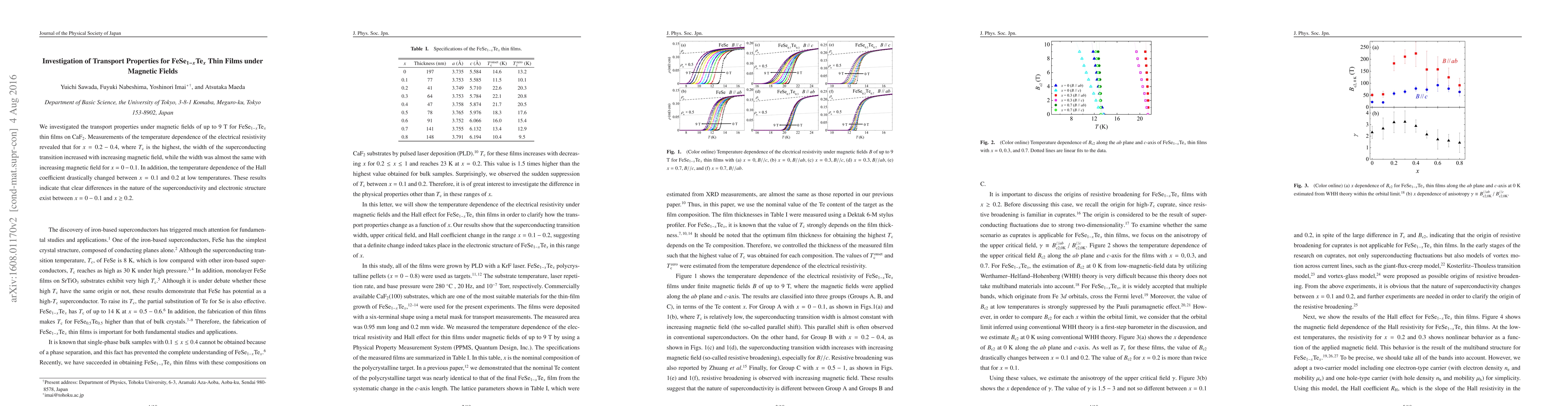 This study investigates the transport properties of FeSe$_{1-x}$Te$_x$ thin films under magnetic fields, revealing that the superconducting transition width increases with magnetic field for $x = 0.2 - 0.4$ but remains nearly constant for $x = 0 - 0.1$. The Hall coefficient's temperature dependence also changes significantly between $x = 0.1$ and $0.2$, indicating distinct superconductivity and electronic structures.