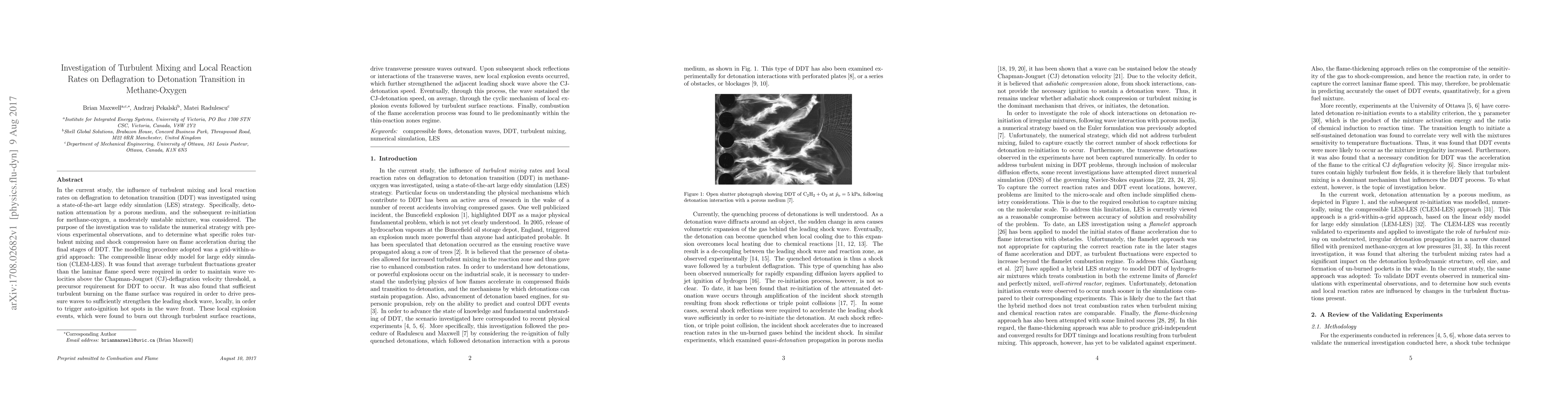 Researchers used a computational model to study how turbulent mixing and local reaction rates influence the transition from deflagration to detonation in methane-oxygen mixtures. They found that sufficient turbulent burning on the flame surface was necessary to trigger auto-ignition hot spots, which drove pressure waves that eventually led to sustained detonation speeds.