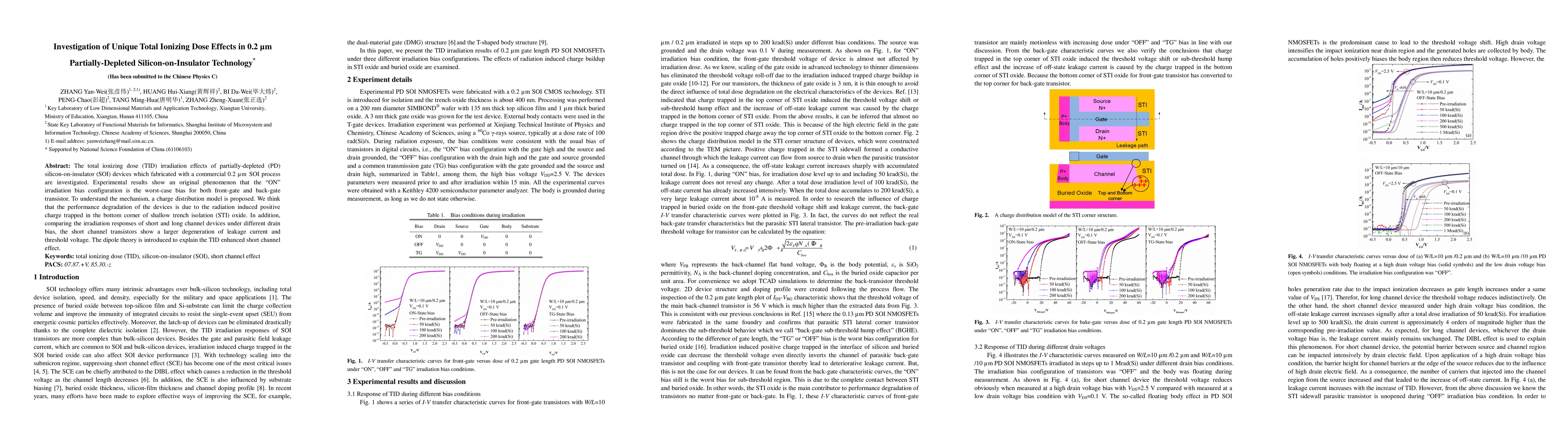 This paper investigates TID effects in 0.2 µm PD-SOI devices, revealing that ON irradiation bias is the worst-case scenario for both front-gate and back-gate transistors. The study proposes a charge distribution model attributing performance degradation to radiation-induced positive charge trapping in the STI oxide, with short channel devices showing greater leakage current and threshold voltage degeneration.