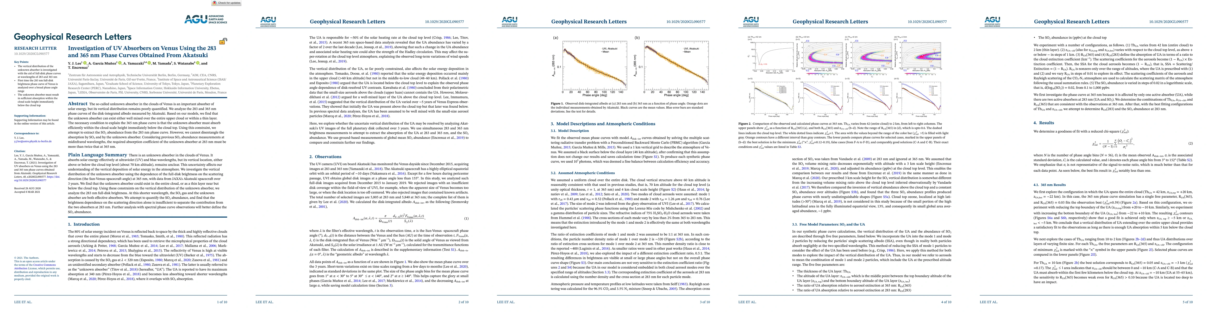 Researchers investigate the unknown UV absorber in Venus' clouds using Akatsuki data, finding it could exist as a well-mixed layer or within a thin cloud, with absorption characteristics that may be more efficient at 365nm than SO2.