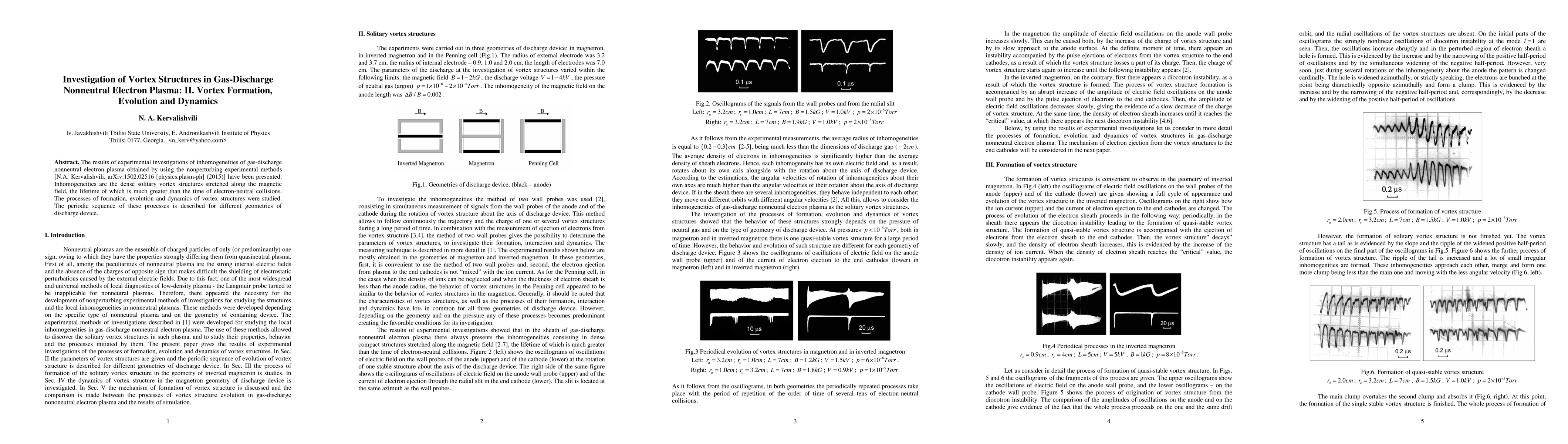 The results of experimental investigations of inhomogeneities of gas-discharge nonneutral electron plasma obtained by using the nonperturbing experimental methods [N.A. Kervalishvili, arXiv:1502.02516 [physics.plasm-ph] (2015)] have been presented. Inhomogeneities are the dense solitary vortex structures stretched along the magnetic field, the lifetime of which is much greater than the time of electron-neutral collisions. The processes of formation, evolution and dynamics of vortex structures were studied. The periodic sequence of these processes is described for different geometries of discharge device.
