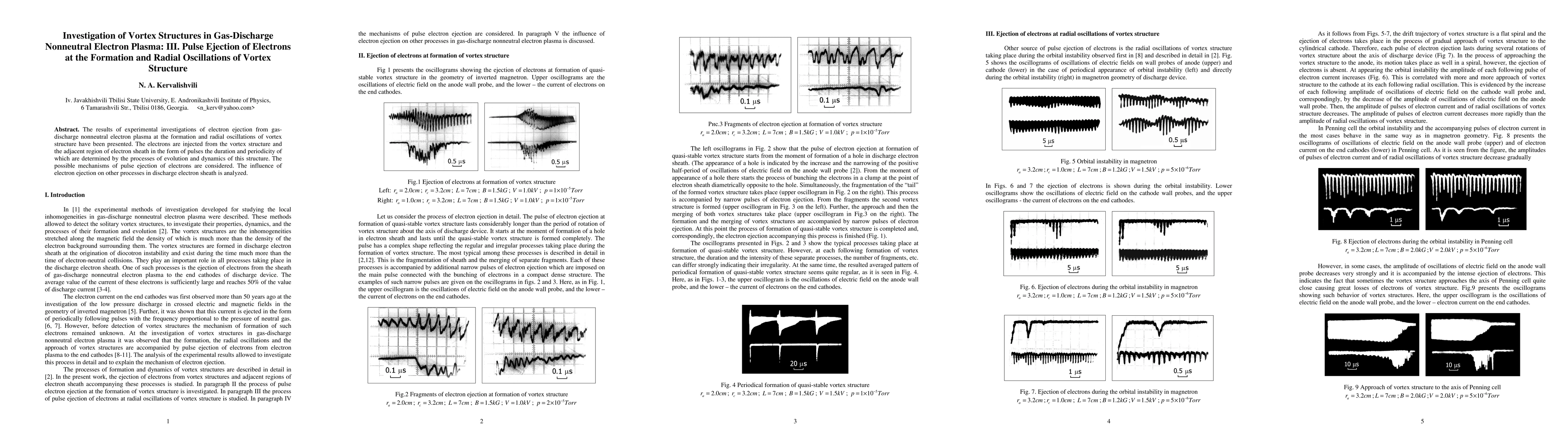 This paper investigates the ejection of electrons in gas-discharge nonneutral electron plasma during the formation and radial oscillations of vortex structures. The study reveals that electrons are ejected in pulses, with their duration and periodicity linked to the vortex dynamics, and explores potential mechanisms for this ejection and its impact on the surrounding plasma.