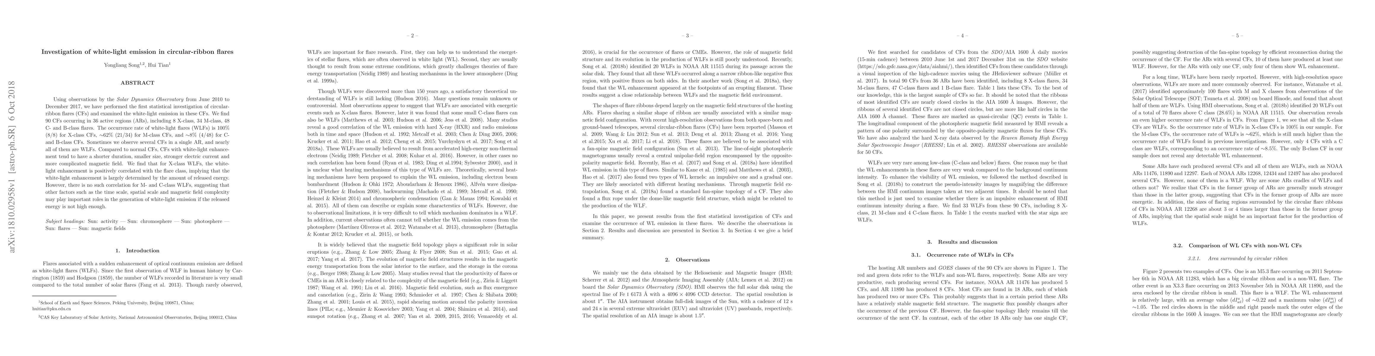 Researchers studied circular-ribbon flares and found that white-light emission is common in X-class flares (100% occurrence rate) but rare in C- and B-class flares, with varying correlations to flare class and energy release.