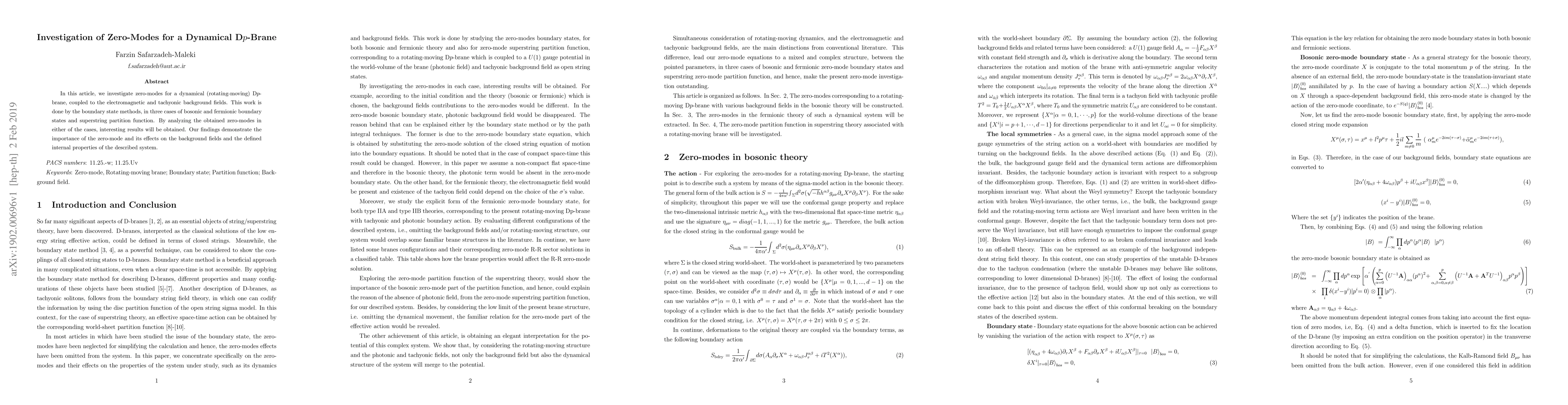 The research investigates zero-modes for a dynamical Dp-brane using boundary state methods, considering bosonic and fermionic boundary states and the superstring partition function.