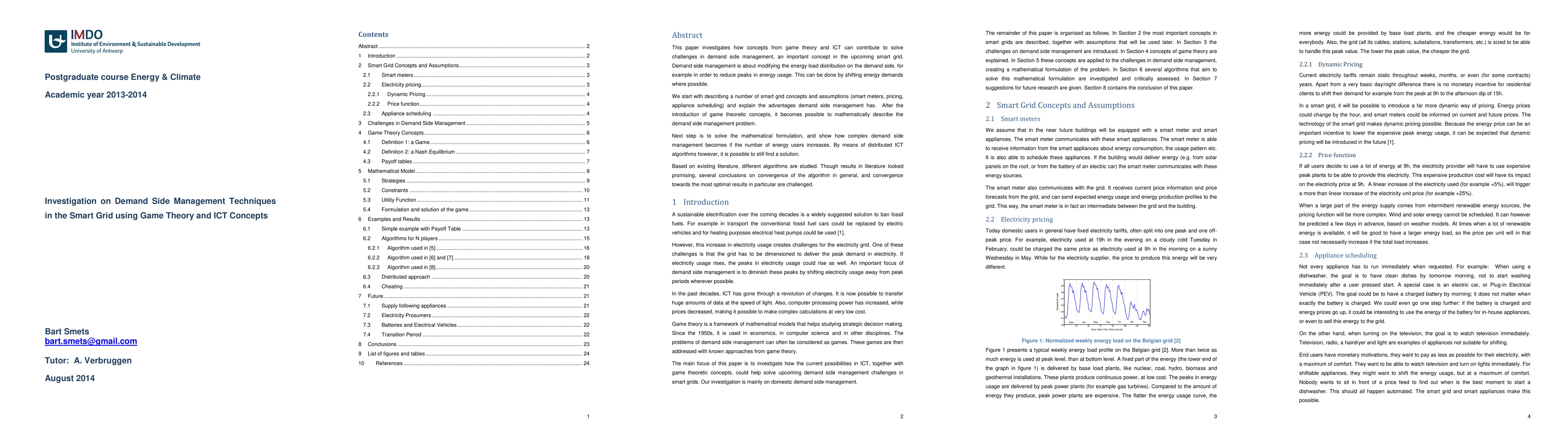 This paper investigates how concepts from game theory and ICT can contribute to solve challenges in demand side management, an important concept in the upcoming smart grid. Demand side management is about modifying the energy load distribution on the demand side, for example in order to reduce peaks in energy usage. This can be done by shifting energy demands where possible. We start with describing a number of smart grid concepts and assumptions (smart meters, pricing, appliance scheduling) and explain the advantages demand side management has. After the introduction of game theoretic concepts, it becomes possible to mathematically describe the demand side management problem. Next step is to solve the mathematical formulation, and show how complex demand side management becomes if the number of energy users increases. By means of distributed ICT algorithms however, it is possible to still find a solution. Based on existing literature, different algorithms are studied. Though results in literature looked promising, several conclusions on convergence of the algorithm in general, and convergence towards the most optimal results in particular are challenged.