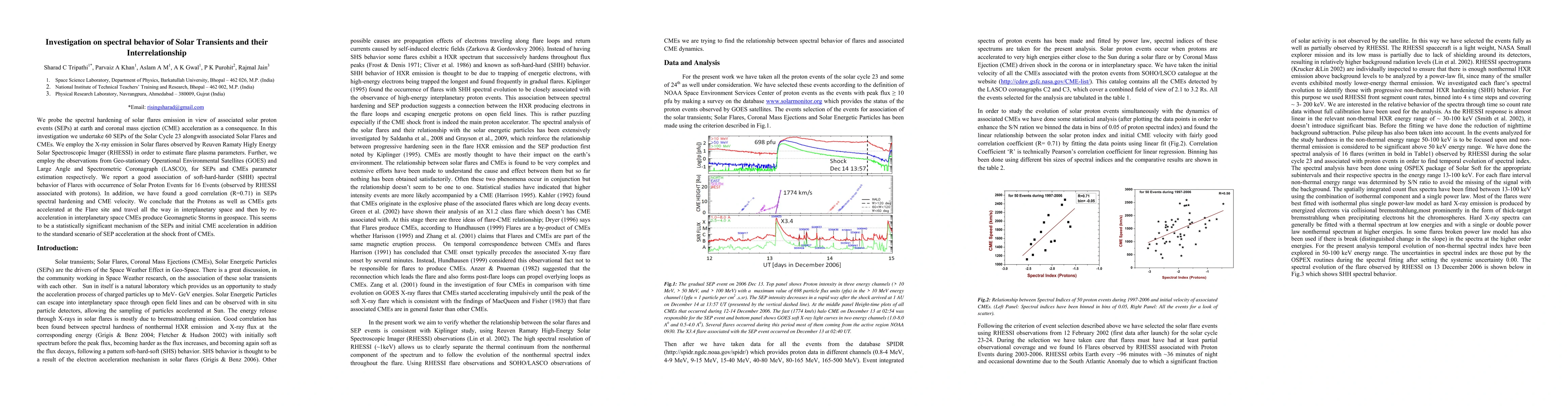 We probe the spectral hardening of solar flares emission in view of associated solar proton events (SEPs) at earth and coronal mass ejection (CME) acceleration as a consequence. In this investigation we undertake 60 SEPs of the Solar Cycle 23 alongwith associated Solar Flares and CMEs. We employ the X-ray emission in Solar flares observed by Reuven Ramaty Higly Energy Solar Spectroscopic Imager (RHESSI) in order to estimate flare plasma parameters. Further, we employ the observations from Geo-stationary Operational Environmental Satellites (GOES) and Large Angle and Spectrometric Coronagraph (LASCO), for SEPs and CMEs parameter estimation respectively. We report a good association of soft-hard-harder (SHH) spectral behavior of Flares with occurrence of Solar Proton Events for 16 Events (observed by RHESSI associated with protons). In addition, we have found a good correlation (R=0.71) in SEPs spectral hardening and CME velocity. We conclude that the Protons as well as CMEs gets accelerated at the Flare site and travel all the way in interplanetary space and then by re-acceleration in interplanetary space CMEs produce Geomagnetic Storms in geospace. This seems to be a statistically significant mechanism of the SEPs and initial CME acceleration in addition to the standard scenario of SEP acceleration at the shock front of CMEs.