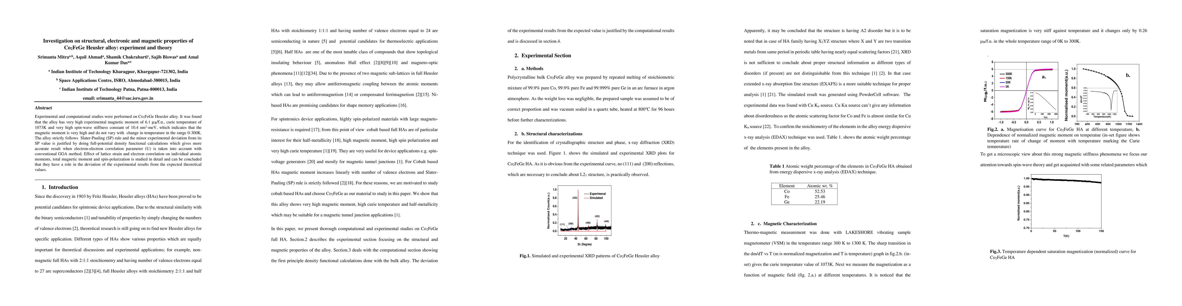 Researchers investigated the Co2FeGe Heusler alloy, discovering it has a high magnetic moment and Curie temperature, with experimental results deviating slightly from theoretical predictions due to lattice strain and electron correlation.