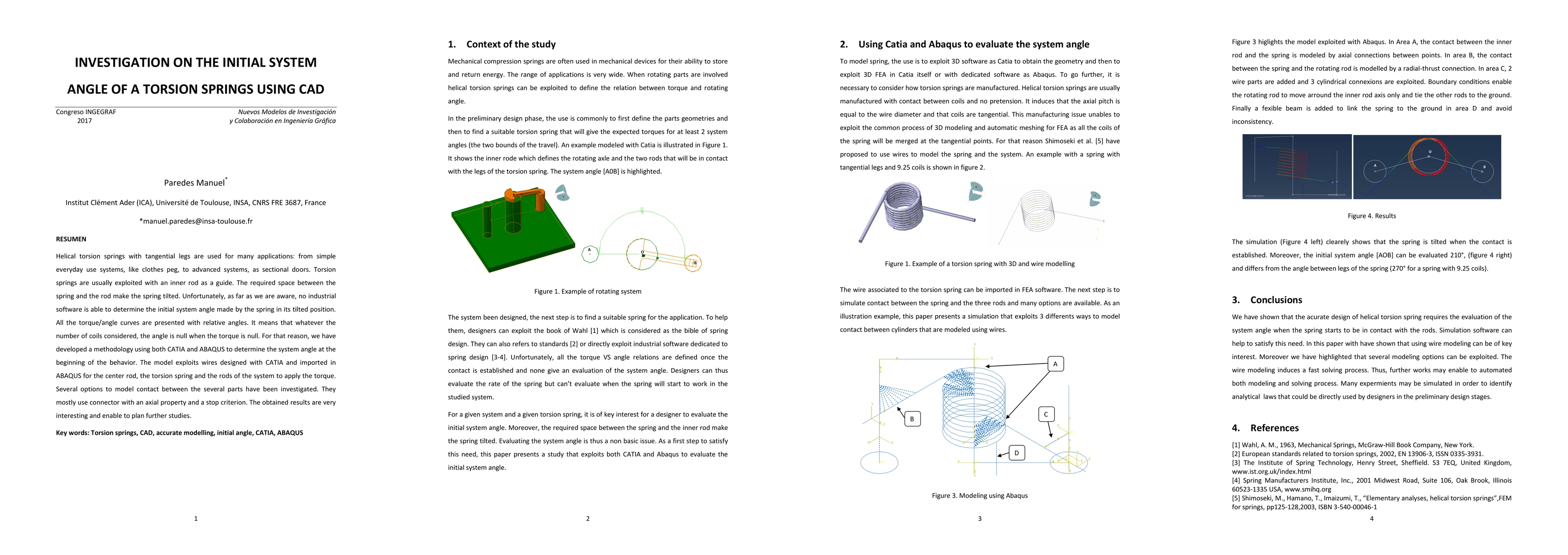 Helical torsion springs with tangential legs are used for many applications: from simple everyday use systems, like clothes peg, to advanced systems, as sectional doors. Torsion springs are usually exploited with an inner rod as a guide. The required space between the spring and the rod make the spring tilted. Unfortunately, as far as we are aware, no industrial software is able to determine the initial system angle made by the spring in its tilted position. All the torque/angle curves are presented with relative angles. It means that whatever the number of coils considered, the angle is null when the torque is null. For that reason, we have developed a methodology using both CATIA and ABAQUS to determine the system angle at the beginning of the behavior. The model exploits wires designed with CATIA and imported in ABAQUS for the center rod, the torsion spring and the rods of the system to apply the torque. Several options to model contact between the several parts have been investigated. They mostly use connector with an axial property and a stop criterion. The obtained results are very interesting and enable to plan further studies.