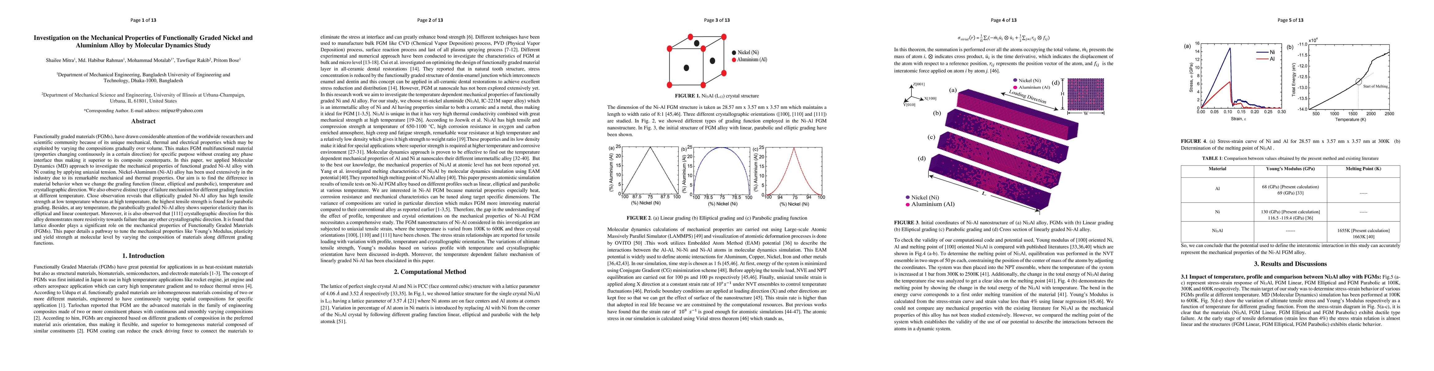 Functionally graded materials (FGMs), have drawn considerable attention of the worldwide researchers and scientific community because of its unique mechanical, thermal and electrical properties which may be exploited by varying the compositions gradually over volume. This makes FGM multifunctional material (properties changing continuously in a certain direction) for specific purpose without creating any phase interface thus making it superior to its composite counterparts. In this paper, we applied Molecular Dynamics (MD) approach to investigate the mechanical properties of functional graded Ni-Al alloy with Ni coating by applying uniaxial tension. Nickel-Aluminum (Ni-Al) alloy has been used extensively in the industry due to its remarkable mechanical and thermal properties. Our aim is to find the difference in material behavior when we change the grading function (linear, elliptical and parabolic), temperature and crystallographic direction. We also observe distinct type of failure mechanism for different grading function at different temperature. Close observation reveals that elliptically graded Ni-Al alloy has high tensile strength at low temperature whereas at high temperature, the highest tensile strength is found for parabolic grading. Besides, at any temperature, the parabolically graded Ni-Al alloy shows superior elasticity than its elliptical and linear counterpart. Moreover, it is also observed that [111] crystallographic direction for this alloy demonstrates more resistivity towards failure than any other crystallographic direction. It is found that lattice disorder plays a significant role on the mechanical properties of Functionally Graded Materials (FGMs). This paper details a pathway to tune the mechanical properties like Young's Modulus, plasticity and yield strength at molecular level by varying the composition of materials along different grading functions.