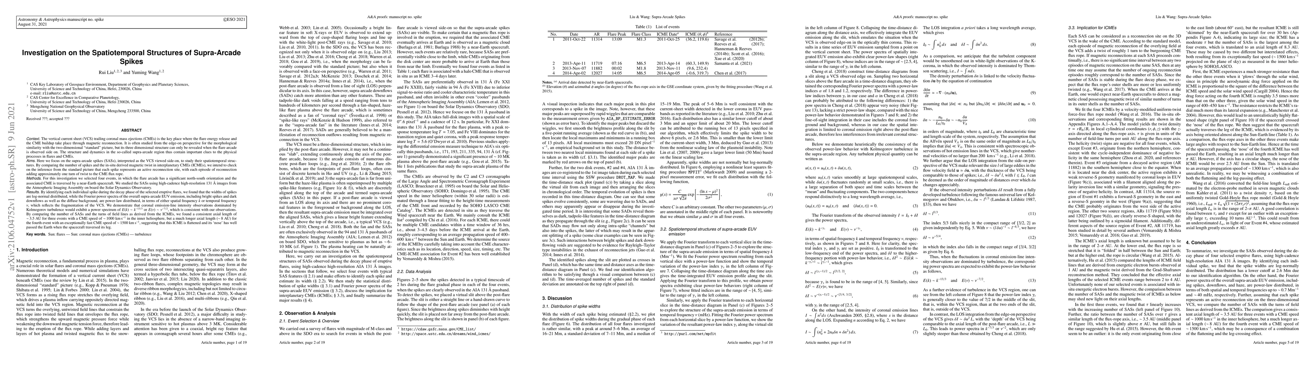 This study investigates the spatiotemporal structures of supra-arcade spikes (SASs) in coronal mass ejections (CMEs), revealing log-normal distributions of spike widths and power-law spectra in supra-arcade EUV emissions, indicative of VCS fragmentation. The findings suggest a correlation between the axial length of CMEs and their speed, with the fastest CME exhibiting a significantly longer axial length.