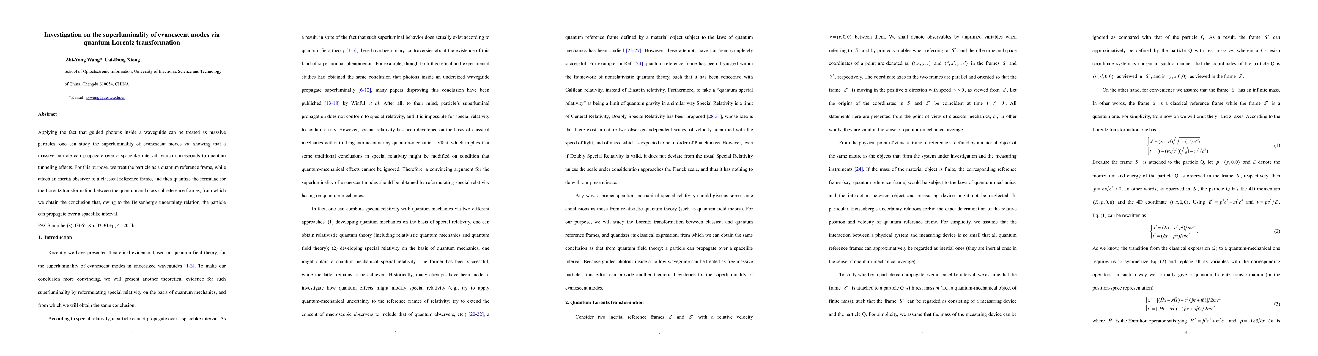 Applying the fact that guided photons inside a waveguide can be treated as massive particles, one can study the superluminality of evanescent modes via showing that a massive particle can propagate over a spacelike interval, which corresponds to quantum tunneling effects. For this purpose, we treat the particle as a quantum reference frame, while attach an inertia observer to a classical reference frame, and then quantize the formulae for the Lorentz transformation between the quantum and classical reference frames, from which we obtain the conclusion that, owing to the Heisenberg's uncertainty relation, the particle can propagate over a spacelike interval.