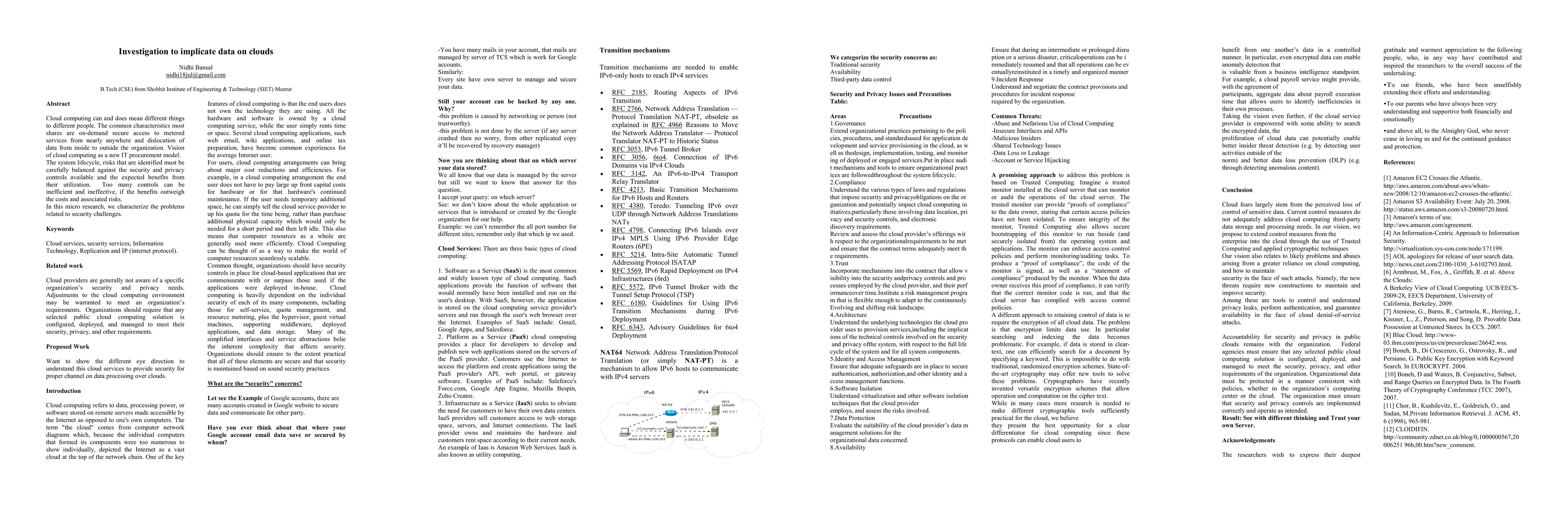 Cloud computing can and does mean different things to different people. The common characteristics most shares are on-demand secure access to metered services from nearly anywhere and dislocation of data from inside to outside the organization. Vision of cloud computing as a new IT procurement model. The system lifecycle, risks that are identified must be carefully balanced against the security and privacy controls available and the expected benefits from their utilization. Too many controls can be inefficient and ineffective, if the benefits outweigh the costs and associated risks. In this micro research, we characterize the problems related to security challenges.