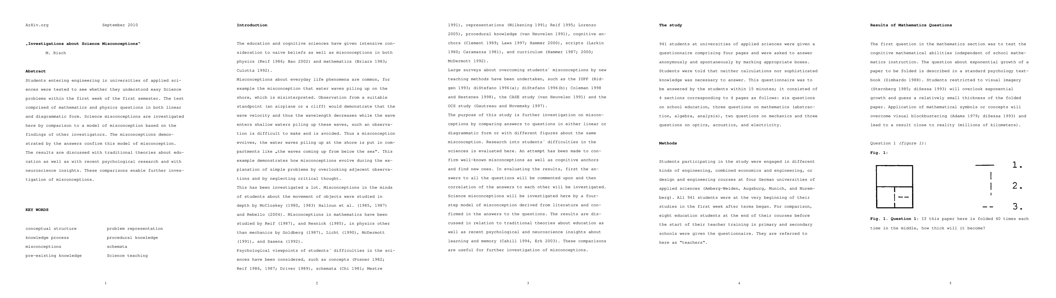 Students entering engineering in universities of applied sciences were tested to see whether they understood easy Science problems within the first week of the first semester. The test comprised of mathematics and physics questions in both linear and diagrammatic form. Science misconceptions are investigated here by comparison to a model of misconception based on the findings of other investigators. The misconceptions demonstrated by the answers confirm this model of misconception. The results are discussed with traditional theories about education as well as with recent psychological research and with neuroscience insights. These comparisons enable further investigation of misconceptions.