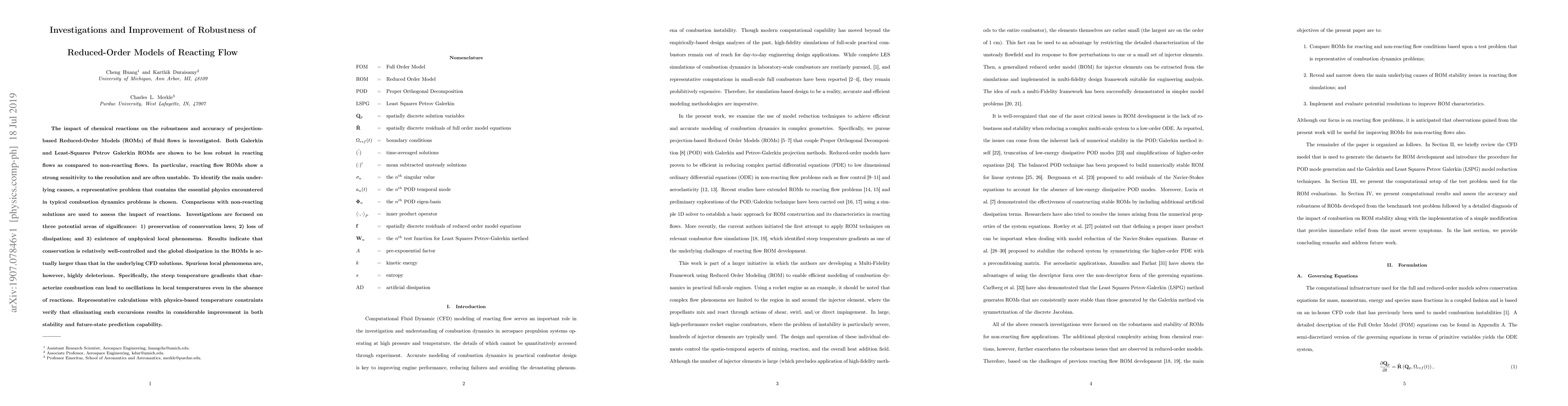 The impact of chemical reactions on the robustness and accuracy of projection-based Reduced-Order Models (ROMs) of fluid flows is investigated. Both Galerkin and Least-Squares Petrov Galerkin ROMs are shown to be less robust in reacting flows as compared to non-reacting flows. In particular, reacting flow ROMs show a strong sensitivity to \st{the} resolution and are often unstable. To identify the main underlying causes, a representative problem that contains the essential physics encountered in typical combustion dynamics problems is chosen. Comparisons with non-reacting solutions are used to assess the impact of reactions. Investigations are focused on three potential areas of significance: 1) preservation of conservation laws; 2) loss of dissipation; and 3) existence of unphysical local phenomena. Results indicate that conservation is relatively well-controlled and the global dissipation in the ROMs is actually larger than that in the underlying CFD solutions. Spurious local phenomena are, however, highly deleterious. Specifically, the steep temperature gradients that characterize combustion can lead to oscillations in local temperatures even in the absence of reactions. Representative calculations with physics-based temperature constraints verify that eliminating such excursions results in considerable improvement in both stability and future-state prediction capability.