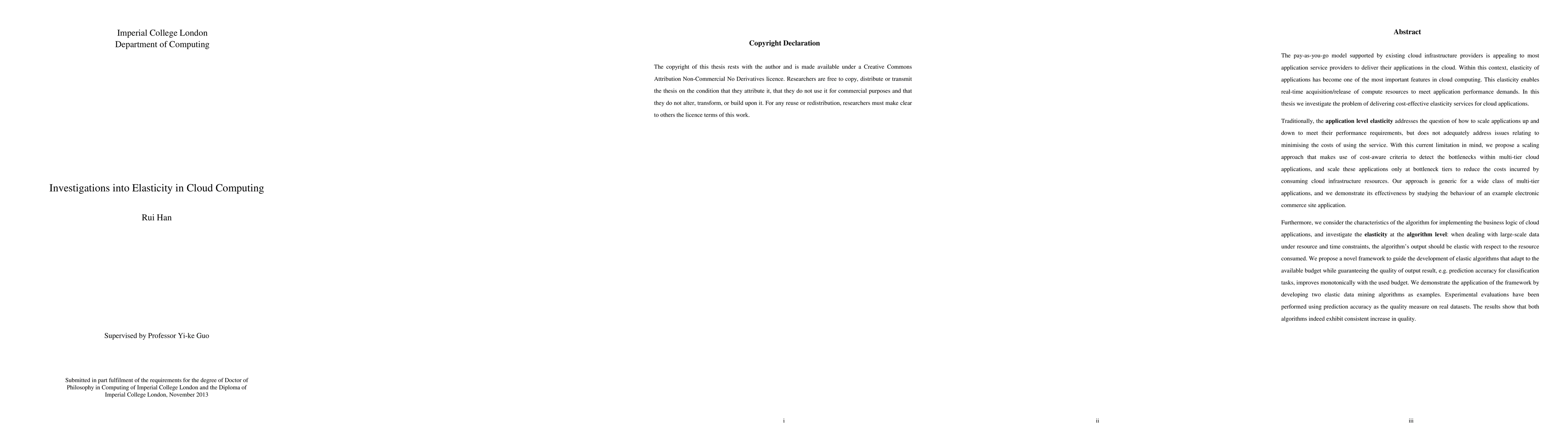 The pay-as-you-go model supported by existing cloud infrastructure providers is appealing to most application service providers to deliver their applications in the cloud. Within this context, elasticity of applications has become one of the most important features in cloud computing. This elasticity enables real-time acquisition/release of compute resources to meet application performance demands. In this thesis we investigate the problem of delivering cost-effective elasticity services for cloud applications. Traditionally, the application level elasticity addresses the question of how to scale applications up and down to meet their performance requirements, but does not adequately address issues relating to minimising the costs of using the service. With this current limitation in mind, we propose a scaling approach that makes use of cost-aware criteria to detect the bottlenecks within multi-tier cloud applications, and scale these applications only at bottleneck tiers to reduce the costs incurred by consuming cloud infrastructure resources. Our approach is generic for a wide class of multi-tier applications, and we demonstrate its effectiveness by studying the behaviour of an example electronic commerce site application. Furthermore, we consider the characteristics of the algorithm for implementing the business logic of cloud applications, and investigate the elasticity at the algorithm level: when dealing with large-scale data under resource and time constraints, the algorithm's output should be elastic with respect to the resource consumed. We propose a novel framework to guide the development of elastic algorithms that adapt to the available budget while guaranteeing the quality of output result, e.g. prediction accuracy for classification tasks, improves monotonically with the used budget.
