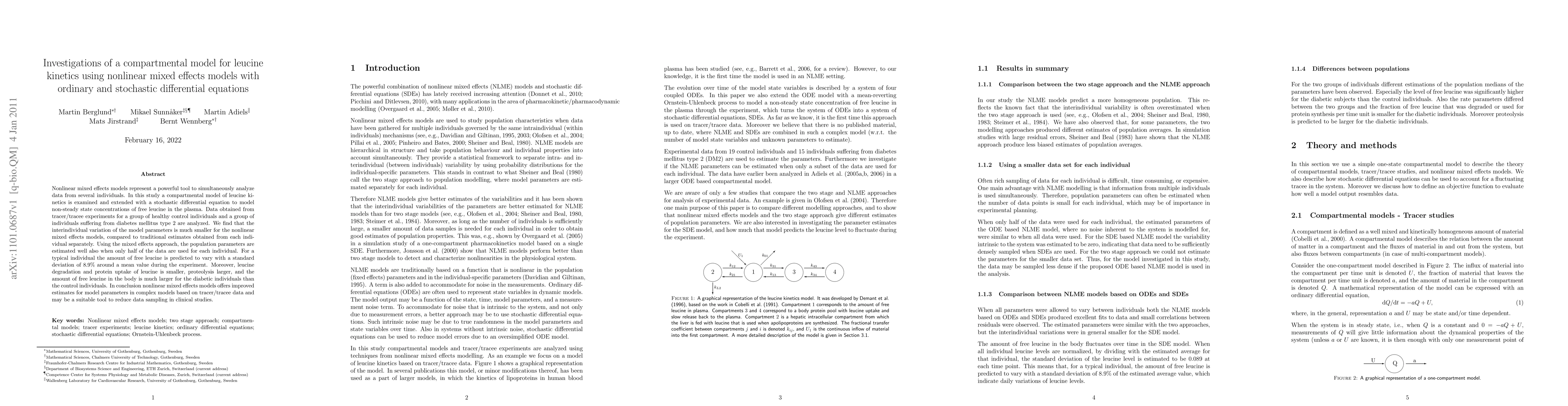 Nonlinear mixed effects models represent a powerful tool to simultaneously analyze data from several individuals. In this study a compartmental model of leucine kinetics is examined and extended with a stochastic differential equation to model non-steady state concentrations of free leucine in the plasma. Data obtained from tracer/tracee experiments for a group of healthy control individuals and a group of individuals suffering from diabetes mellitus type 2 are analyzed. We find that the interindividual variation of the model parameters is much smaller for the nonlinear mixed effects models, compared to traditional estimates obtained from each individual separately. Using the mixed effects approach, the population parameters are estimated well also when only half of the data are used for each individual. For a typical individual the amount of free leucine is predicted to vary with a standard deviation of 8.9% around a mean value during the experiment. Moreover, leucine degradation and protein uptake of leucine is smaller, proteolysis larger, and the amount of free leucine in the body is much larger for the diabetic individuals than the control individuals. In conclusion nonlinear mixed effects models offers improved estimates for model parameters in complex models based on tracer/tracee data and may be a suitable tool to reduce data sampling in clinical studies.