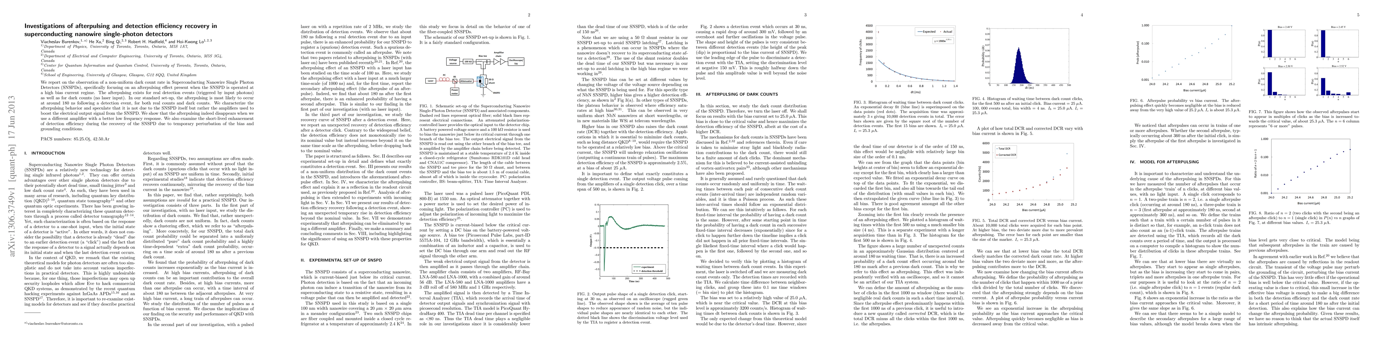 This paper investigates the afterpulsing effect in Superconducting Nanowire Single Photon Detectors (SNSPDs) and finds it occurs both for real detection events and dark counts, likely due to the amplifiers rather than the SNSPD itself. The study shows that switching to an amplifier with better low frequency response eliminates the afterpulsing, and explores the temporary boost in detection efficiency during SNSPD recovery.