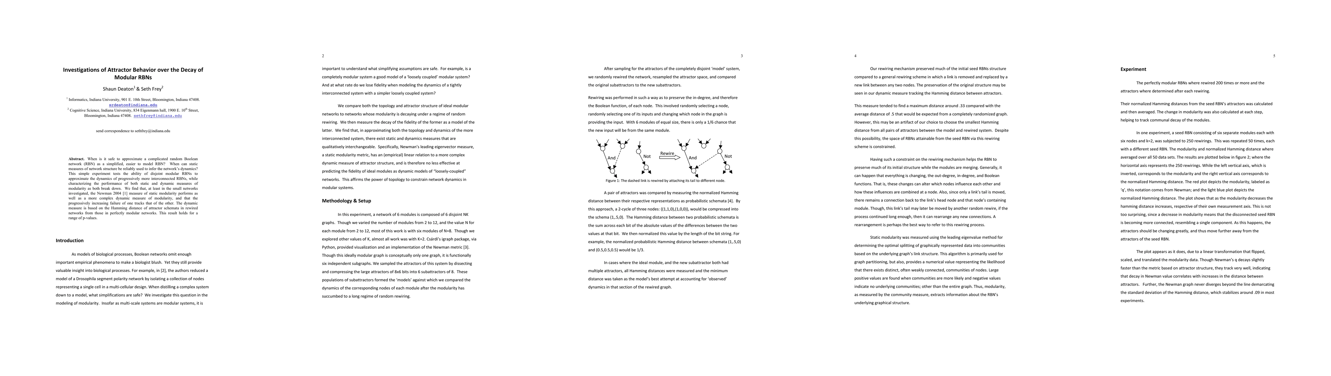 When is it safe to approximate a complicated random Boolean network (RBN) as a simplified, easier to model RBN? When can static measures of network structure be reliably used to infer the network's dynamics? This simple experiment tests the ability of disjoint modular RBNs to approximate the dynamics of progressively more interconnected RBNs, while characterizing the performance of both static and dynamic measures of modularity as both break down. We find that, at least in the small networks investigated, the Newman 2004 [1] measure of static modularity performs as well as a more complex dynamic measure of modularity, and that the progressively increasing failure of one tracks that of the other. The dynamic measure is based on the Hamming distance of attractor schemata in rewired networks from those in perfectly modular networks. This result holds for a range of p-values.