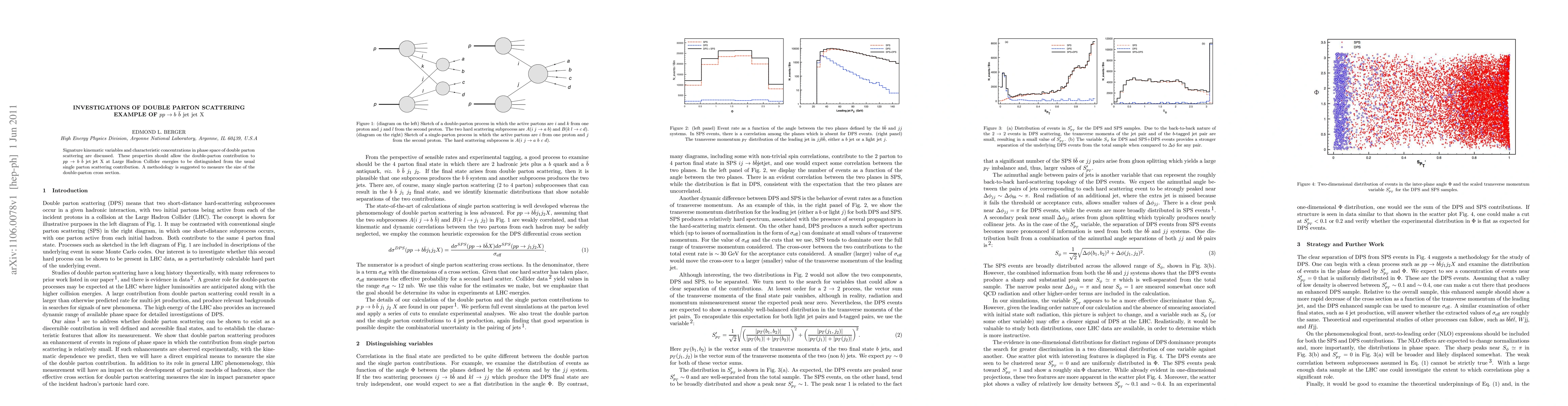 Signature kinematic variables and characteristic concentrations in phase space of double parton scattering are discussed. These properties should allow the double parton contribution to $pp \rightarrow b \bar{b} \rm {jet jet} X$ at Large Hadron Collider energies to be distinguished from the usual single parton scattering contribution. A methodology is suggested to measure the size of the double-parton cross section.