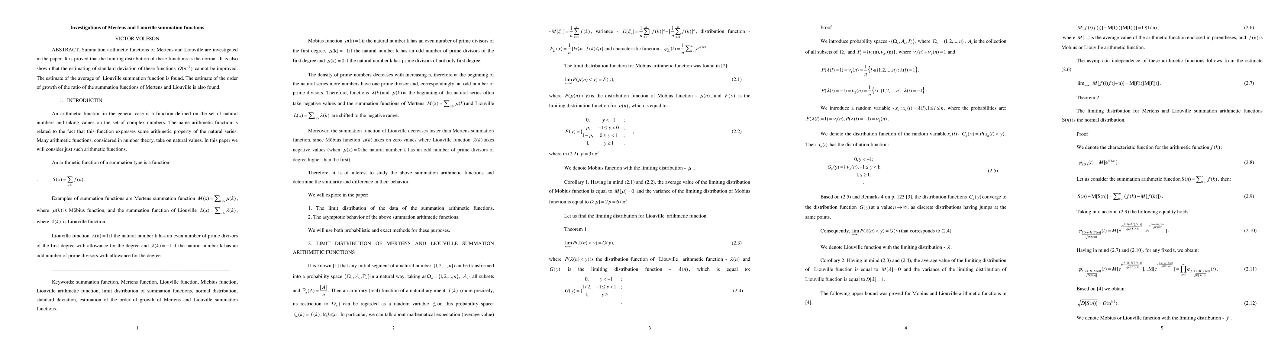 Summation arithmetic functions of Mertens and Liouville are investigated in the paper. It is proved that the limiting distribution of these functions is the normal. It is also shown that the estimating of standard deviation of these functions $O(n^{1/2})$ cannot be improved. The estimate of the average of Liouville summation function is found. The estimate of the order of growth of the ratio of the summation functions of Mertens and Liouville is also found.