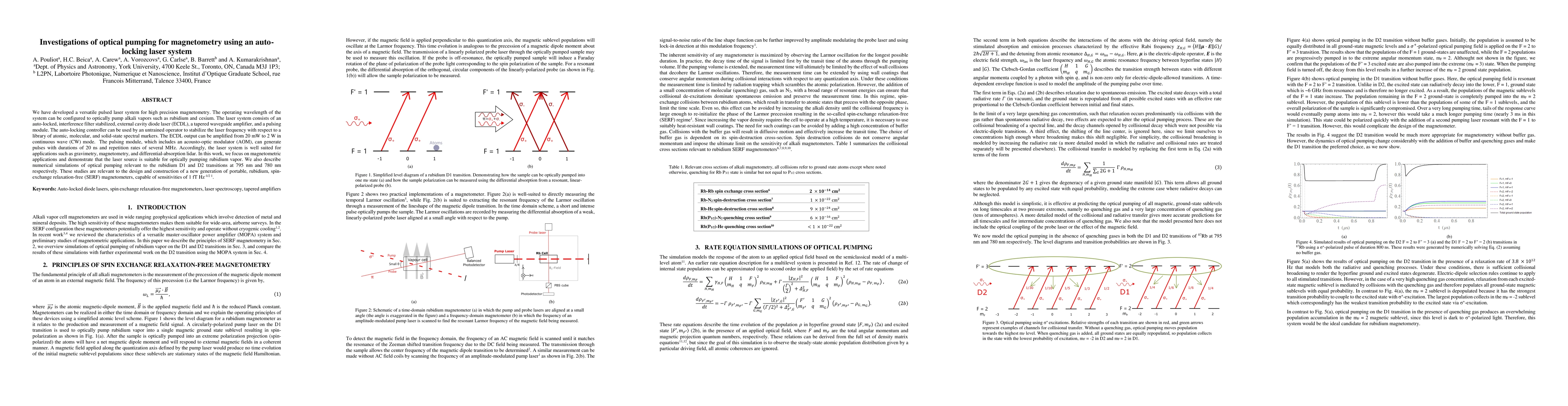 We have developed a versatile pulsed laser system for high precision magnetometry. The operating wavelength of the system can be configured to optically pump alkali vapors such as rubidium and cesium. The laser system consists of an auto-locked, interference filter stabilized, external cavity diode laser (ECDL), a tapered waveguide amplifier, and a pulsing module. The auto-locking controller can be used by an untrained operator to stabilize the laser frequency with respect to a library of atomic, molecular, and solid-state spectral markers. The ECDL output can be amplified from 20 mW to 2 W in continuous wave (CW) mode. The pulsing module, which includes an acousto-optic modulator (AOM), can generate pulses with durations of 20 ns and repetition rates of several MHz. Accordingly, the laser system is well suited for applications such as gravimetry, magnetometry, and differential-absorption lidar. In this work, we focus on magnetometric applications and demonstrate that the laser source is suitable for optically pumping rubidium vapor. We also describe numerical simulations of optical pumping relevant to the rubidium D1 and D2 transitions at 795 nm and 780 nm respectively. These studies are relevant to the design and construction of a new generation of portable, rubidium, spin-exchange relaxation-free (SERF) magnetometers, capable of sensitivities of 1 fT Hz-1/2 1.