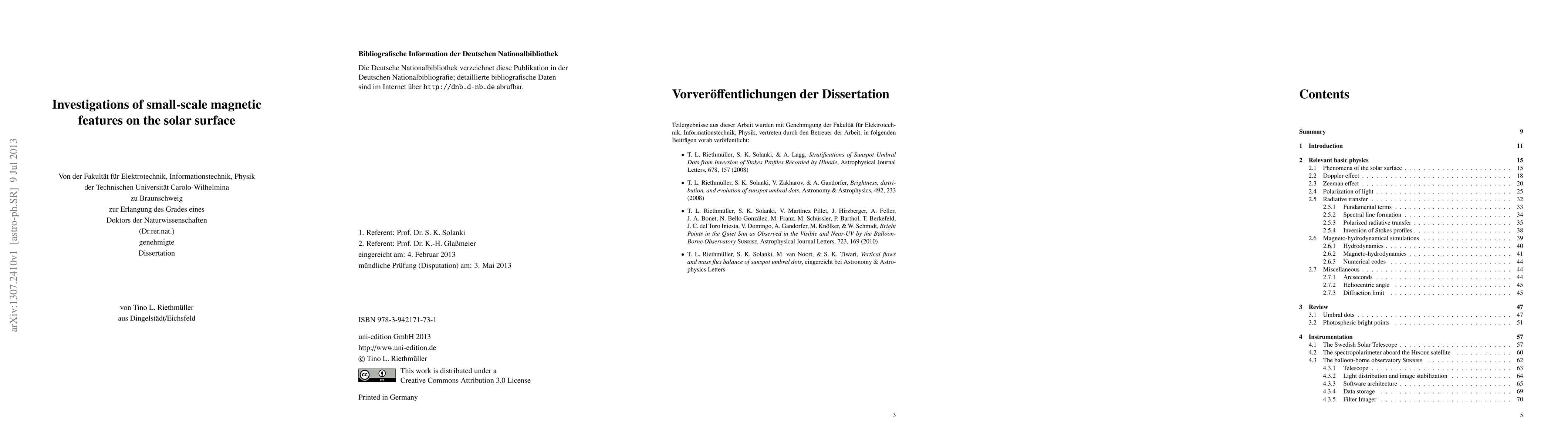 Solar activity is controlled by the magnetic field, which also causes the variability of the solar irradiance that in turn is thought to influence the climate on Earth. The magnetic field manifests itself in the form of structures of largely different sizes. This thesis concentrates on two types of the smallest known magnetic features: The first part studies the properties of umbral dots, dot-like bright features in the dark umbra of a sunspot. The obtained umbral dot properties provide a remarkable confirmation of the results of recent magneto-hydrodynamical simulations. Observations as well as simulations show that umbral dots differ from their surroundings mainly in the lowest photospheric layers, where the temperature is enhanced and the magnetic field is weakened. In addition, the interior of the umbral dots displays strong upflow velocities which are surrounded by weak downflows. This qualitative agreement further strengthens the interpretation of umbral dots as localized columns of overturning convection. The second part of the thesis investigates bright points, which are small-scale brightness enhancements in the darker intergranular lanes of the quiet Sun produced by magnetic flux concentrations. Observational data obtained by the balloon-borne solar telescope SUNRISE are used in this thesis. For the first time contrasts of bright points in the important ultraviolet spectral range are determined. A comparison of observational data with magneto-hydrodynamical simulations revealed a close correspondence, but only after effects due to the limited spectral and spatial resolution were carefully included. 98% of the synthetic bright points are found to be associated with a nearly vertical kilo-Gauss field.