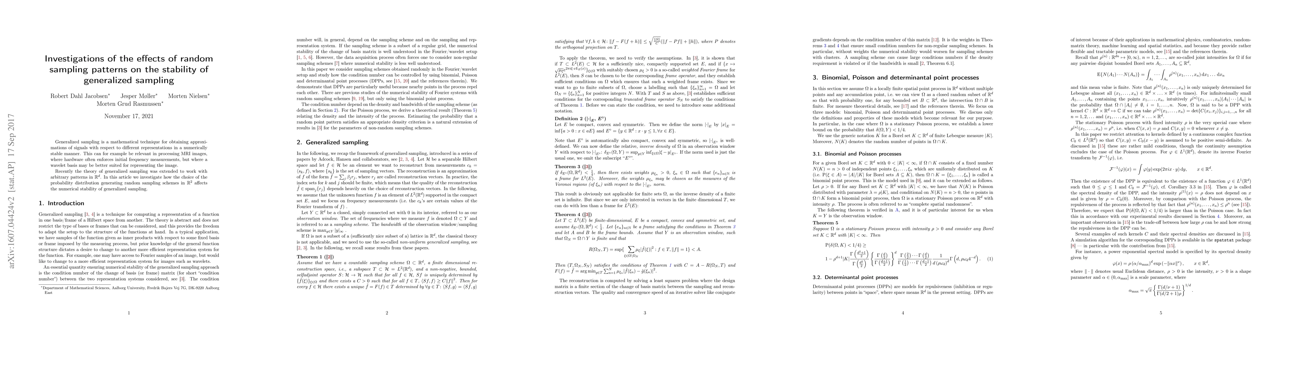 This research explores how different random sampling patterns, generated by binomial, Poisson, and determinantal point processes, impact the stability of non-uniform generalized sampling. It concludes that determinantal point processes, due to their regularity, enhance numerical stability when working with Fourier bases and Daubechies scaling functions.