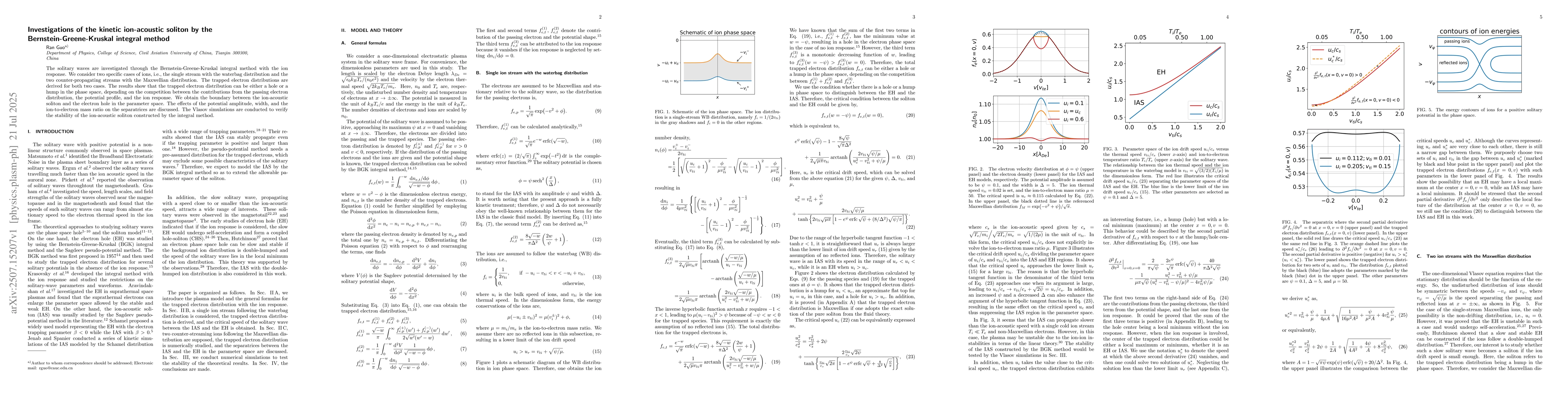 The research investigates solitary waves using the Bernstein-Greene-Kruskal (BGK) integral method with ion response, considering specific ion cases like single stream with waterbag distribution and two counter-propagating streams with Maxwellian distribution.
