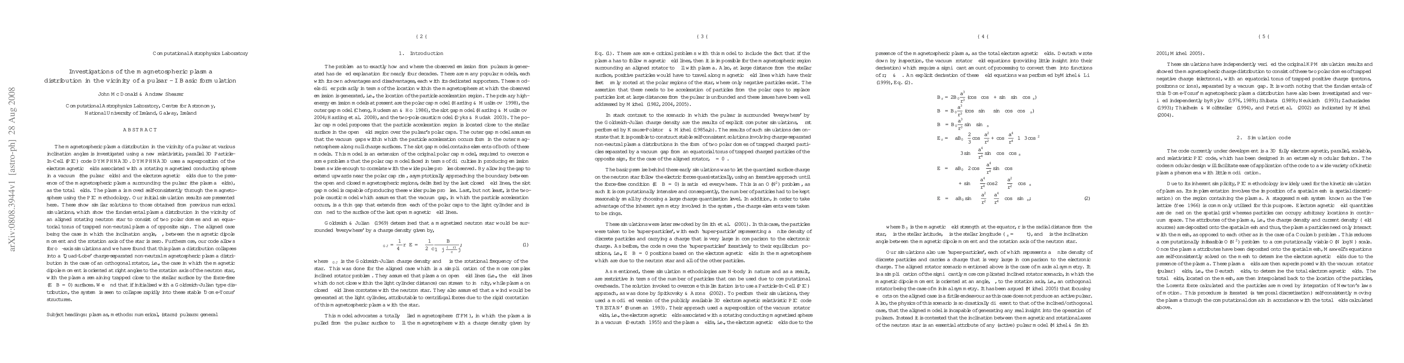 This paper investigates the magnetospheric plasma distribution around pulsars using a new relativistic 3D Particle-In-Cell code, DYMPHNA3D, which models the interaction of pulsar fields and plasma fields. Initial simulations show fundamental plasma structures, including polar domes and an equatorial torus, which collapse into Quad-Lobe configurations for orthogonal rotators.