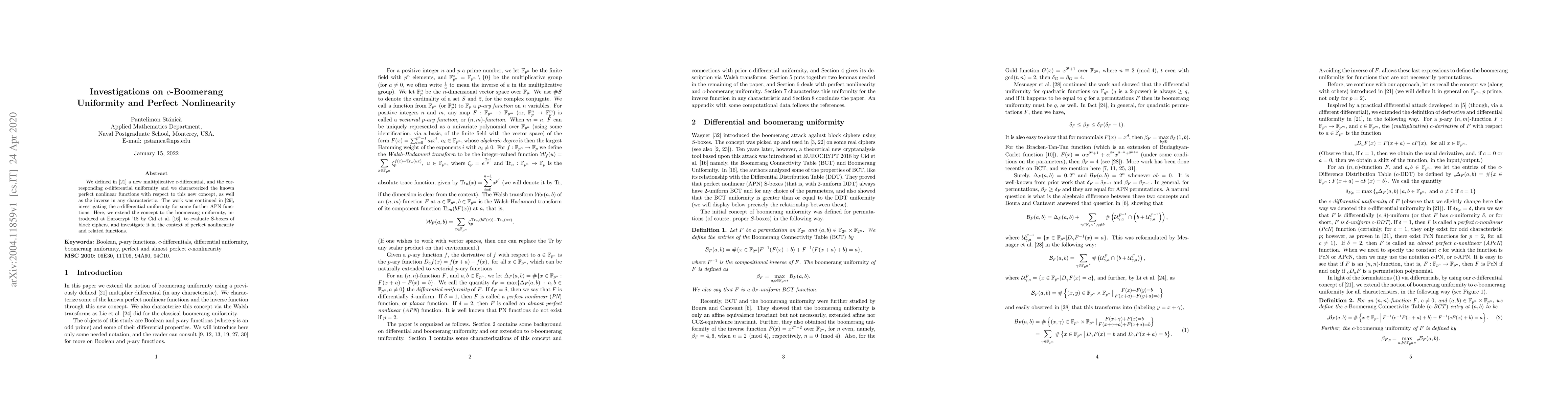 We defined in~\cite{EFRST20} a new multiplicative $c$-differential, and the corresponding $c$-differential uniformity and we characterized the known perfect nonlinear functions with respect to this new concept, as well as the inverse in any characteristic. The work was continued in~\cite{RS20}, investigating the $c$-differential uniformity for some further APN functions. Here, we extend the concept to the boomerang uniformity, introduced at Eurocrypt '18 by Cid et al.~\cite{Cid18}, to evaluate S-boxes of block ciphers, and investigate it in the context of perfect nonlinearity and related functions.