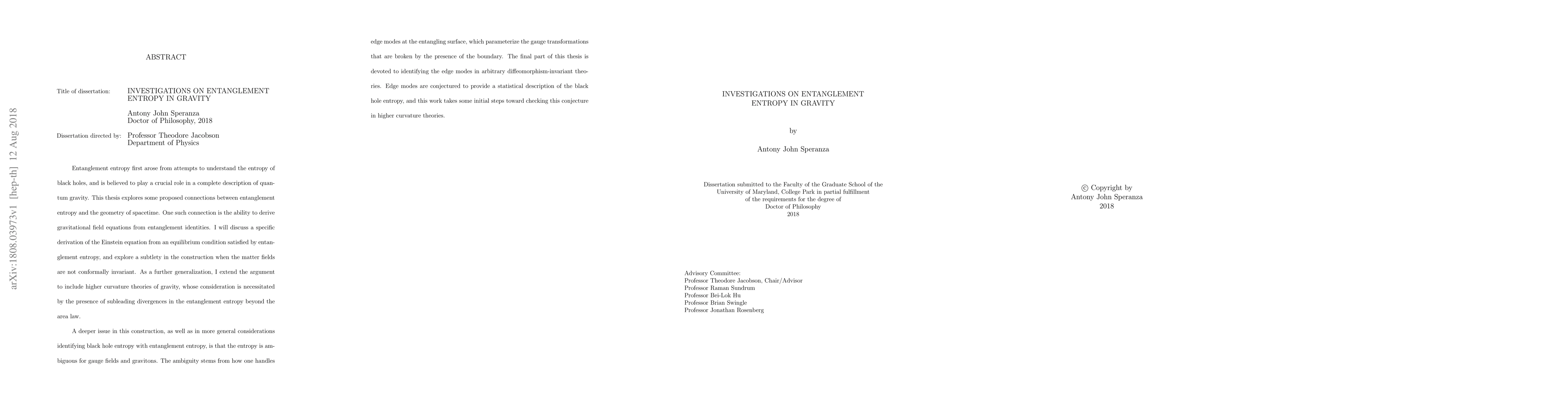 This paper investigates the relationship between entanglement entropy and the geometry of spacetime, deriving gravitational field equations from entanglement identities, specifically the Einstein equation. It addresses ambiguities in entanglement entropy for gauge fields and gravitons, focusing on edge modes and their role in describing black hole entropy, particularly in higher curvature theories of gravity.