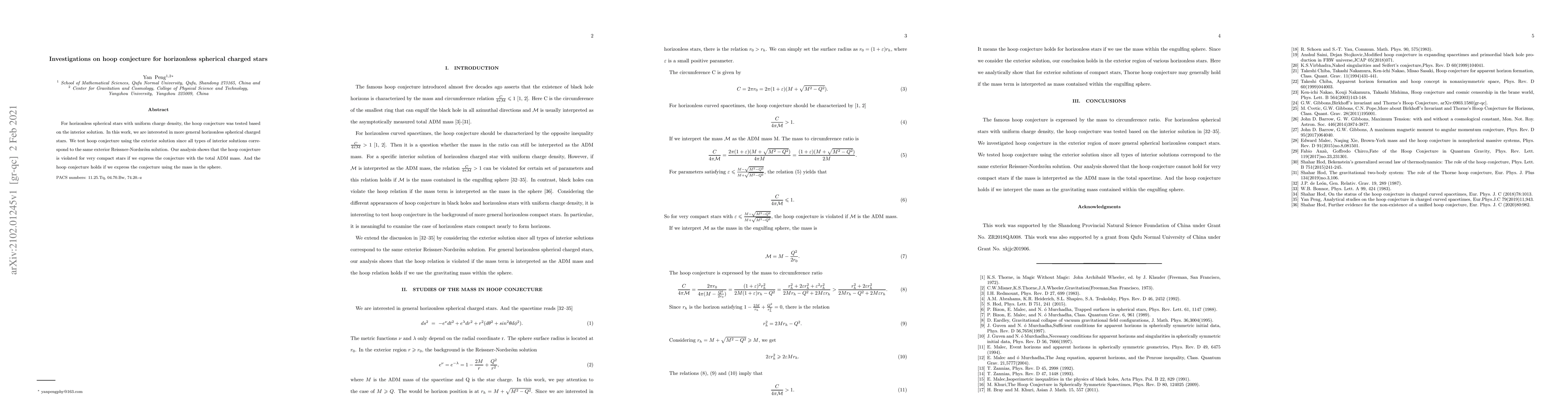 The work provides a new analysis of the hoop conjecture in horizonless spherical charged stars using exterior solutions of Reissner-Nordsröm spacetimes.