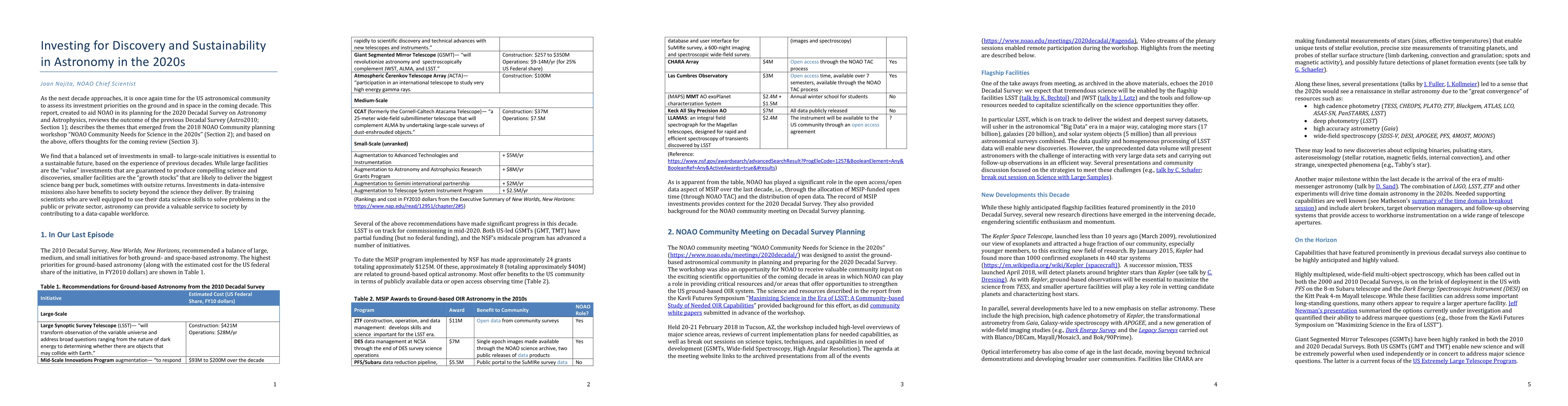 As the next decade approaches, it is once again time for the US astronomical community to assess its investment priorities for the coming decade on the ground and in space. This report, created to aid NOAO in its planning for the 2020 Decadal Survey on Astronomy and Astrophysics, reviews the outcome of the previous Decadal Survey (Astro2010); describes the themes that emerged from the 2018 NOAO community planning workshop "NOAO Community Needs for Science in the 2020s"; and based on the above, offers thoughts for the coming review. We find that a balanced set of investments in small- to large-scale initiatives is essential to a sustainable future, based on the experience of previous decades. While large facilities are the "value" investments that are guaranteed to produce compelling science and discoveries, smaller facilities are the "growth stocks" that are likely to deliver the biggest science bang per buck, sometimes with outsize returns. Investments in data-intensive missions also have benefits to society beyond the science they deliver. By training scientists who are well equipped to use their data science skills to solve problems in the public or private sector, astronomy can provide a valuable service to society by contributing to a data-capable workforce.