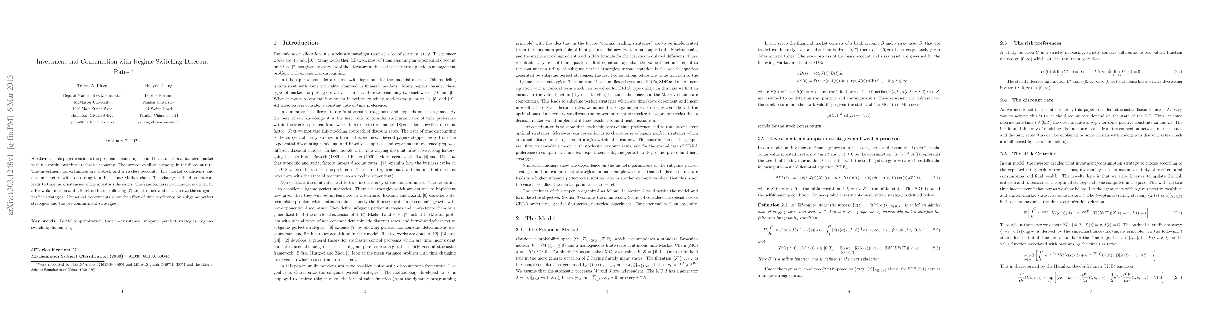 The paper analyzes consumption and investment problems in a continuous-time stochastic economy with regime-switching discount rates, using a Markov chain to model randomness and Brownian motion for market coefficients. It introduces and characterizes subgame perfect strategies, comparing them with pre-commitment strategies through numerical experiments.