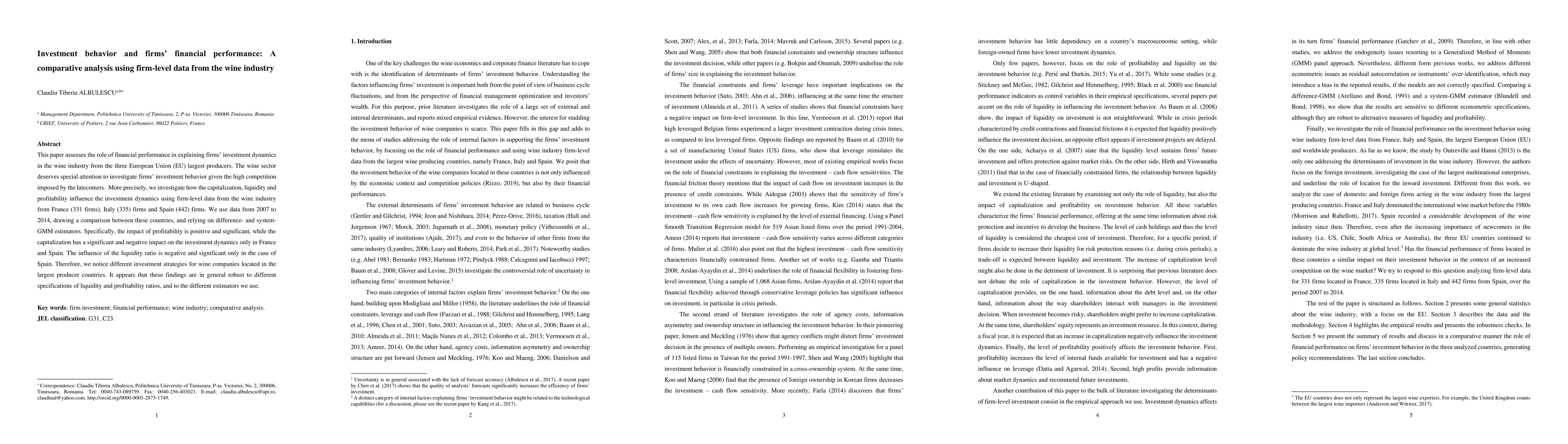 This paper assesses the role of financial performance in explaining firms' investment dynamics in the wine industry from the three European Union (EU) largest producers. The wine sector deserves special attention to investigate firms' investment behavior given the high competition imposed by the latecomers. More precisely, we investigate how the capitalization, liquidity and profitability influence the investment dynamics using firm-level data from the wine industry from France (331 firms), Italy (335) firms and Spain (442) firms. We use data from 2007 to 2014, drawing a comparison between these countries, and relying on difference-and system-GMM estimators. Specifically, the impact of profitability is positive and significant, while the capitalization has a significant and negative impact on the investment dynamics only in France and Spain. The influence of the liquidity ratio is negative and significant only in the case of Spain. Therefore, we notice different investment strategies for wine companies located in the largest producer countries. It appears that these findings are in general robust to different specifications of liquidity and profitability ratios, and to the different estimators we use.