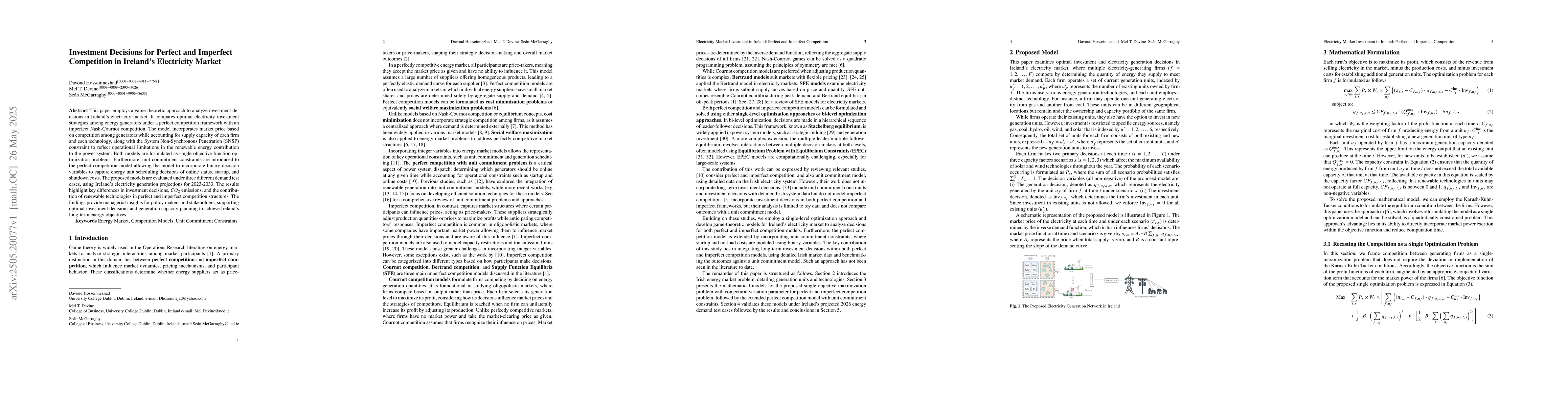 This paper analyzes investment decisions in Ireland's electricity market under perfect and imperfect competition frameworks, highlighting differences in investments, carbon emissions, and renewable energy contributions. The study provides managerial insights for policymakers and stakeholders to support optimal investment decisions and generation capacity planning.