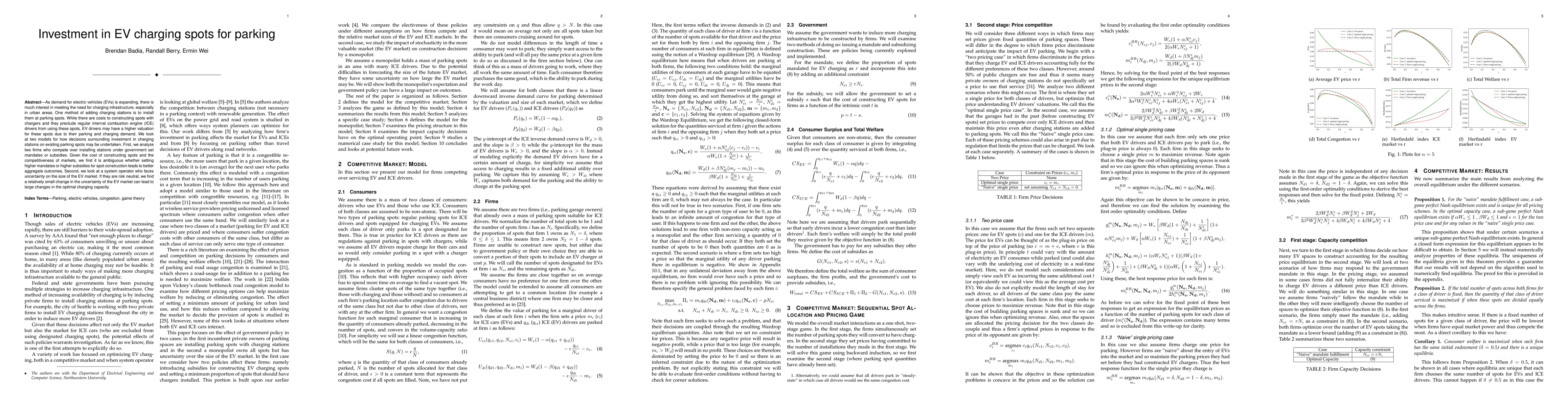 As demand for electric vehicles (EVs) is expanding, meeting the need for charging infrastructure, especially in urban areas, has become a critical issue. One method of adding charging stations is to install them at parking spots. This increases the value of these spots to EV drivers needing to charge their vehicles. However, there is a cost to constructing these spots and such spots may preclude drivers not needing to charge from using them, reducing the parking options for such drivers\color{black}. We look at two models for how decisions surrounding investment in charging stations on existing parking spots may be undertaken. First, we analyze two firms who compete over installing stations under government set mandates or subsidies. Given the cost of constructing spots and the competitiveness of the markets, we find it is ambiguous whether setting higher mandates or higher subsidies for spot construction leads to better aggregate outcomes. Second, we look at a system operator who faces uncertainty on the size of the EV market. If they are risk neutral, we find a relatively small change in the uncertainty of the EV market can lead to large changes in the optimal charging capacity.