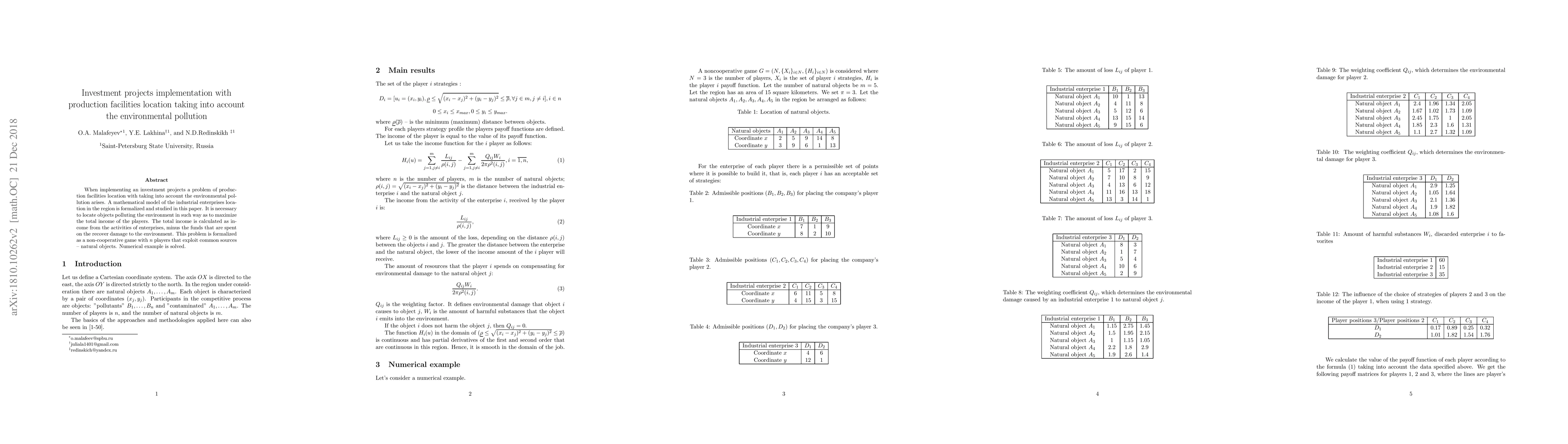 A mathematical model is developed to optimize the location of production facilities that minimize environmental pollution while maximizing income for investors. The study uses a non-cooperative game framework to calculate total income from business activities minus environmental damage costs.