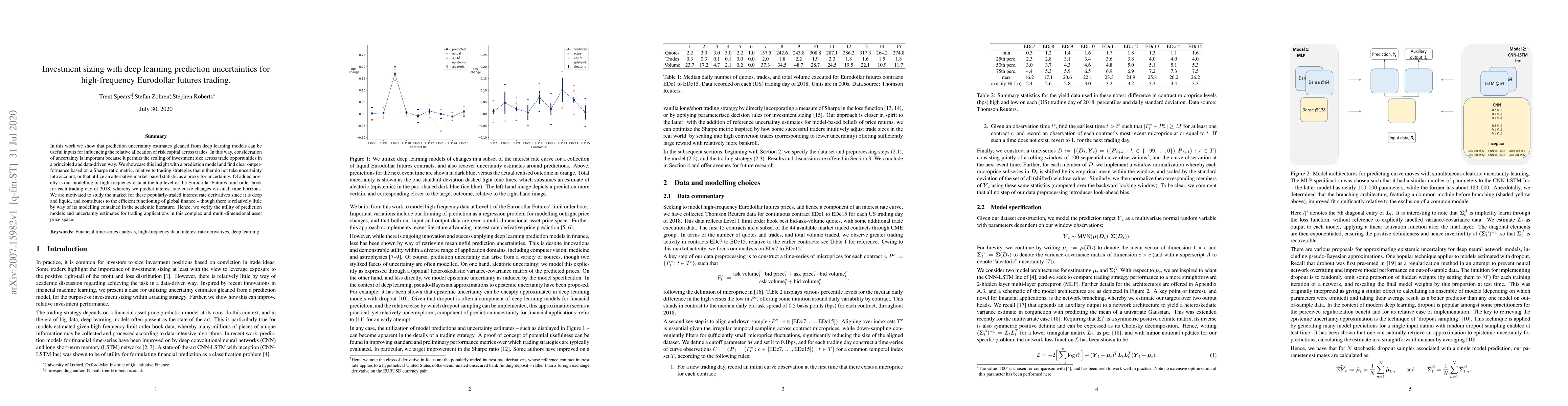 This paper demonstrates that deep learning models can predict uncertainty, which aids in optimizing investment sizing for high-frequency Eurodollar futures trading. The study shows improved performance using a Sharpe ratio, highlighting the benefits of incorporating uncertainty estimates compared to traditional methods.
