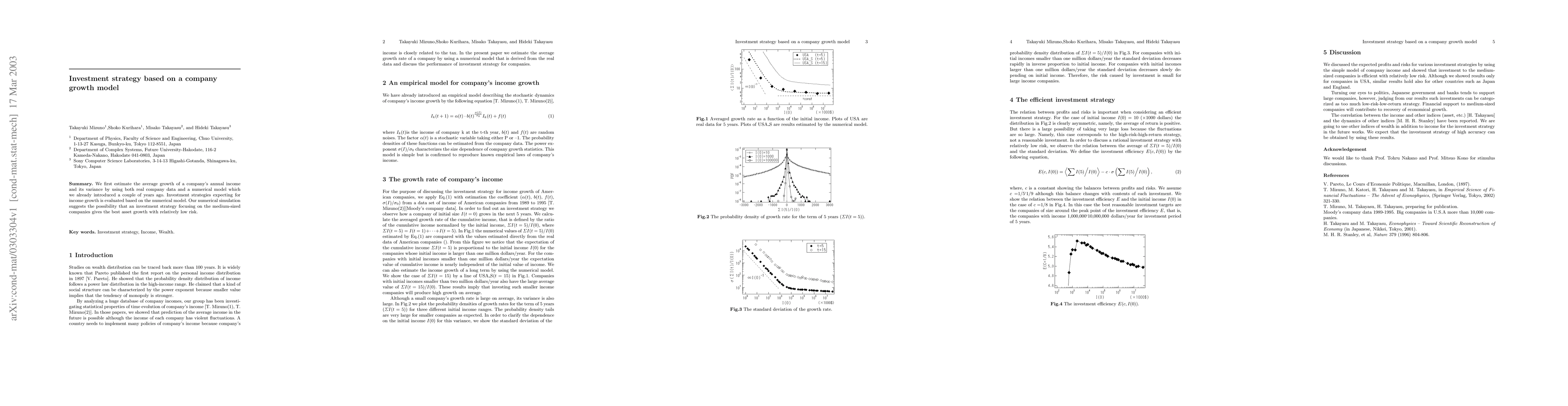 We first estimate the average growth of a company's annual income and its variance by using both real company data and a numerical model which we already introduced a couple of years ago. Investment strategies expecting for income growth is evaluated based on the numerical model. Our numerical simulation suggests the possibility that an investment strategy focusing on the medium-sized companies gives the best asset growth with relatively low risk.