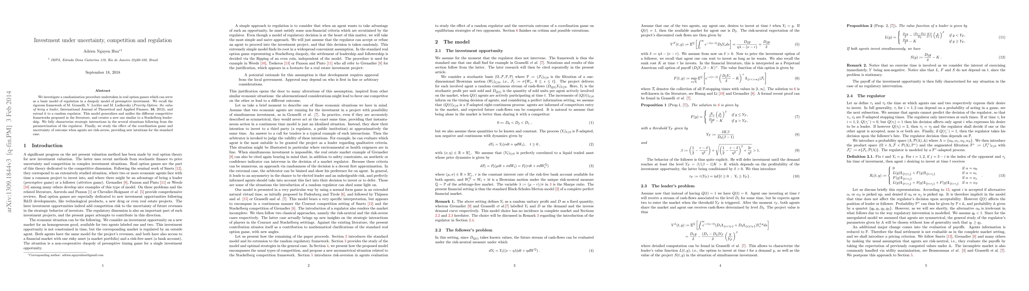 This paper extends a real option game model to include a random regulator in a duopoly setting, unifying various competitive frameworks and characterizing strategic interactions under different regulatory conditions. It also explores the impact of risk-aversion and coordination games in the presence of outcome uncertainty.
